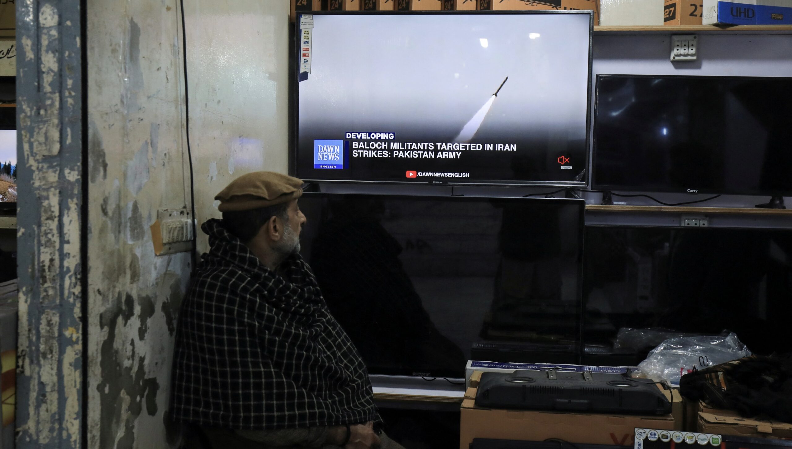 Image: A man watches a news channel on television inside a shop after the Pakistani foreign ministry said the country conducted strikes inside Iran targeting separatist militants, two days after Tehran said it attacked Israel-linked militant bases inside Pakistani territory, in Peshawar, Pakistan January 18, 2024. REUTERS/Fayaz Aziz