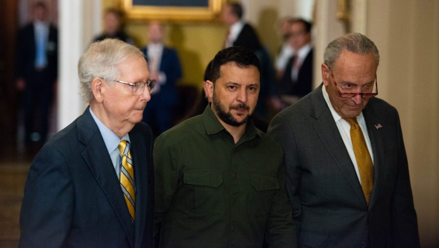 Image: President of Ukraine Volodymyr Zelenskyy walks to a meeting with United States Senate Minority Leader Mitch McConnell (Republican of Kentucky) and United States Senate Majority Leader Chuck Schumer (Democrat of New York) in the Ohio Clock Corridor in the Capitol building on Thursday, September 21, 2023. Featuring: Volodymyr Zelenskyy Where: Washington, District of Columbia, United States When: 21 Sep 2023 Credit: CNP/startraksphoto.com