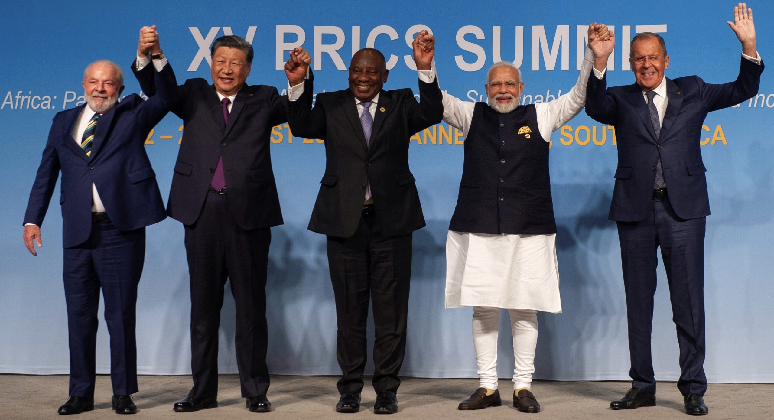 Image: Brazil's President Luiz Inacio Lula da Silva, China's President Xi Jinping, South African President Cyril Ramaphosa, Indian Prime Minister Narendra Modi and Russia's Foreign Minister Sergei Lavrov pose for a picture at the BRICS Summit in Johannesburg, South Africa August 23, 2023. REUTERS/Alet Pretorius/Pool