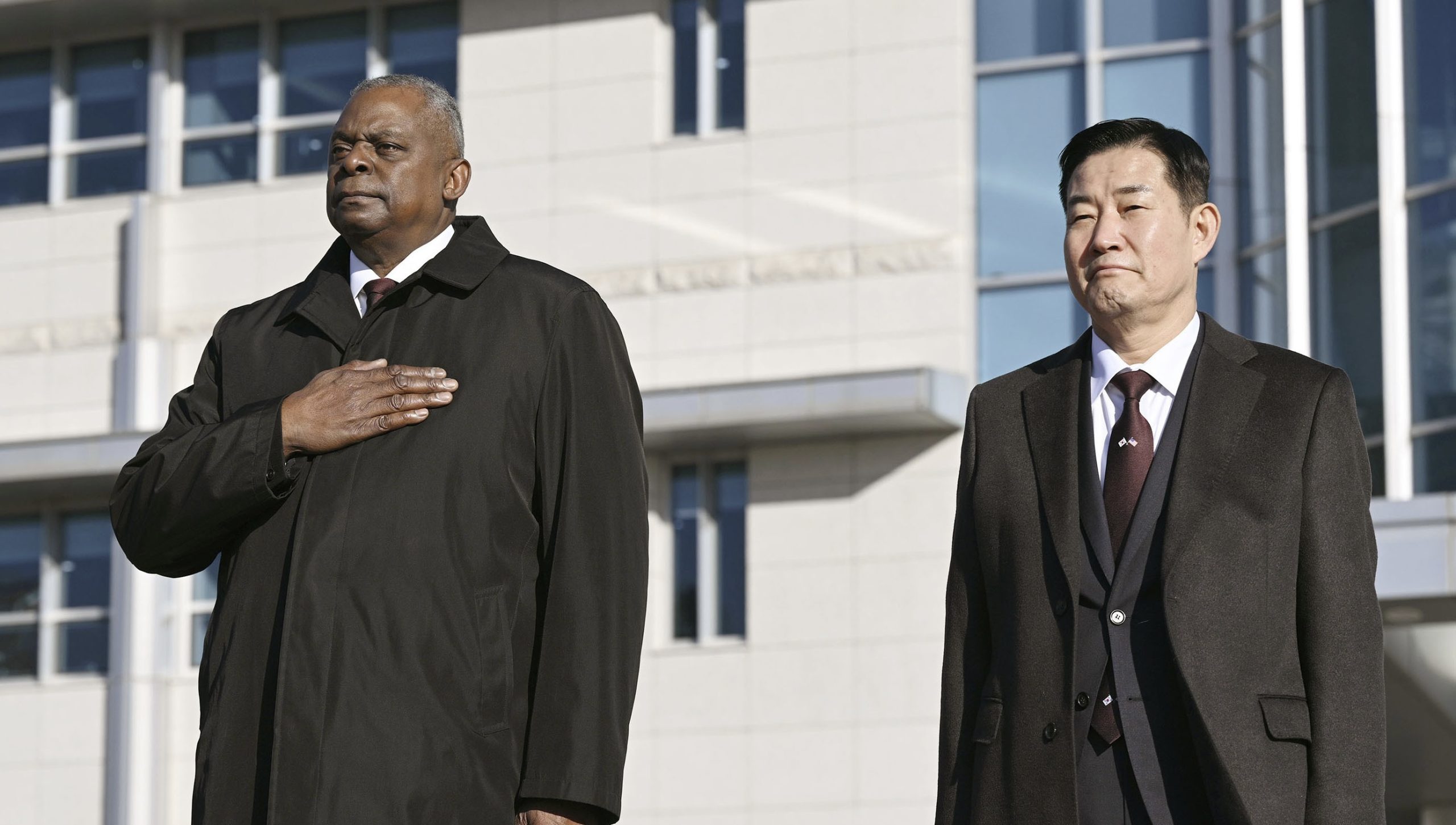 Image: US Defense Secretary Lloyd Austin (L) and his South Korean counterpart Shin Won Sik attend a ceremony for the fifty-fifth Security Consultative Meeting in Seoul on Nov. 13, 2023. (Pool photo) (Kyodo)