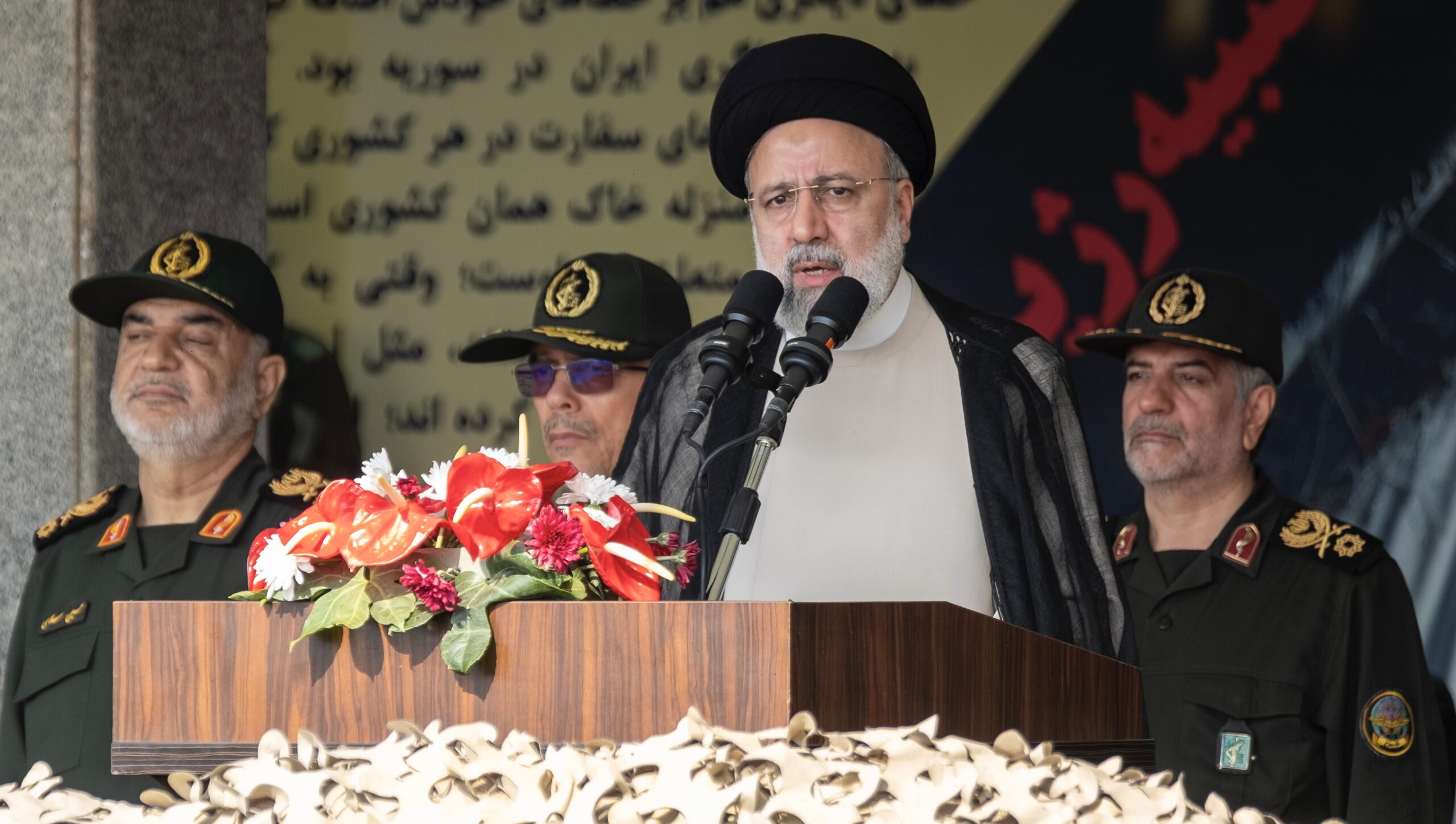 Image: Iranian President Ebrahim Raisi (2nd R) is addressing attendees at a military parade marking Iran's Army Day anniversary at an Army military base in Tehran, Iran, on April 17, 2024. (Photo by Morteza Nikoubazl/NurPhoto)