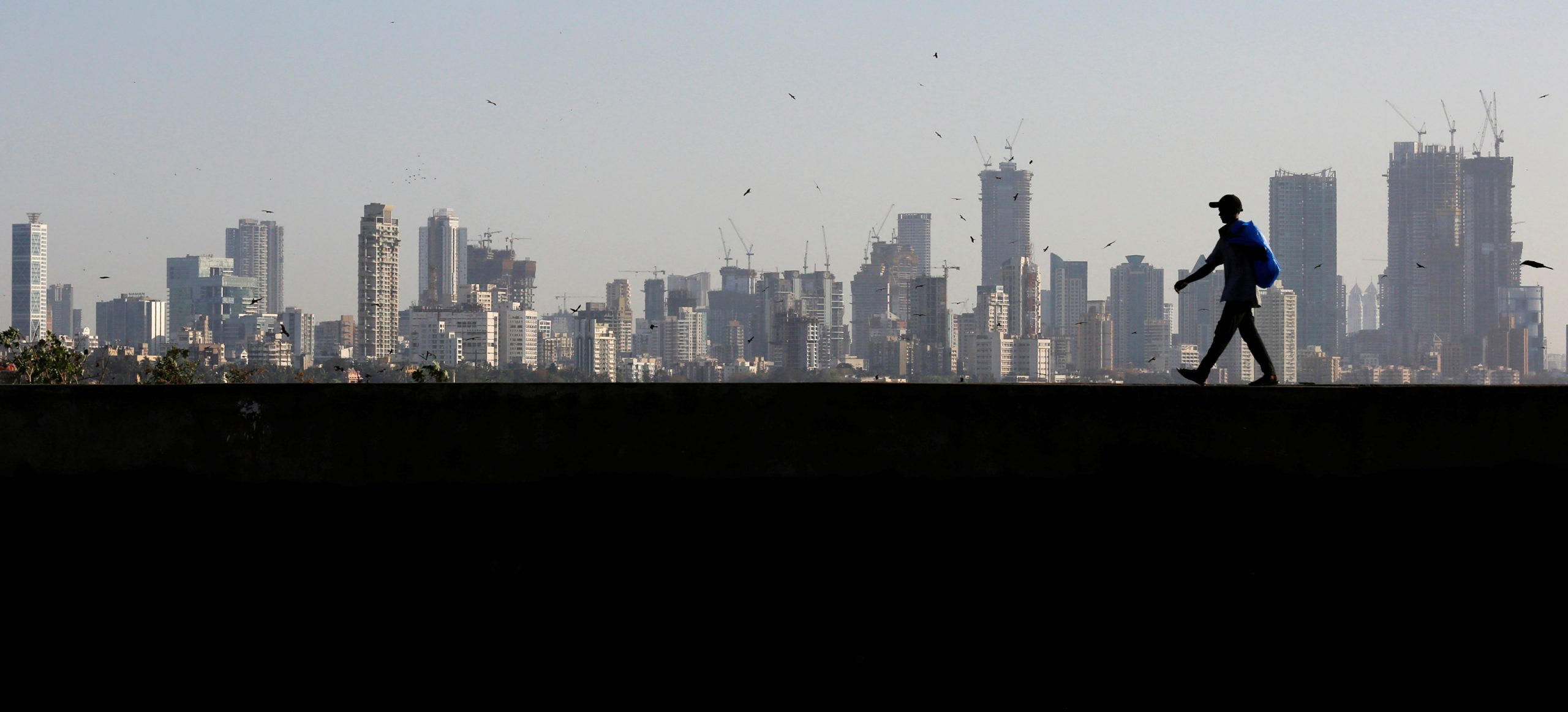 Image: A man walks along a wall overlooking the central Mumbai's financial district skyline, India, March 9, 2017. REUTERS/Danish Siddiqui