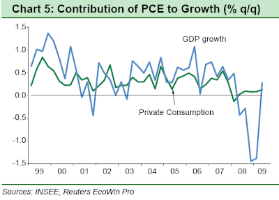 On the other hand, general sales were down by a quarterly 2.5% in Q3, while “other manufactured products” sales, that represent more than 40% of the consumption, remain sluggish, rising by a quarterly 0.1% in Q3 following a drop of 0.1% in Q2. So at the end of the day the data tend to confirm the idea that the evolution of total spending has been largely dependant on car sales and government incentive scheme since the beginning of the year. Despite the rebound recorded in September, the stabilisation of car sales in Q3 resulted in a slight decrease of overall spending, that was down by 0.2% in Q3 when compared with Q2, following a 0.7% rise in Q2. As can be seen in the chart below (which was prepared by Dominique Barbet and Martine Borde for PNB Paribas) even while headline GDP shot down at the end of 2008 Private Consumption Expenditure (PCE) recovered rapidly due to the impact of the stimulus programme.
