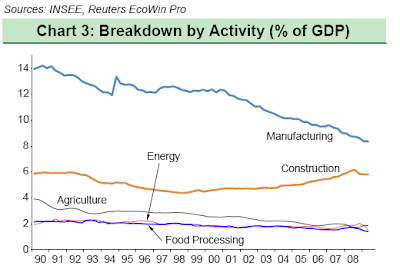And as we can see in the following chart, while consumption in France has proved quite robust over the years, the manufacturing share in GDP has been declining steadily. This is, of course, quite a worrying trend. We can also see quite a clear indication of why France doesn’t have the kind of problems Ireland and Spain have when we look at the construction share, since while this rose slightly between 2004 and 2007, at around 6% of GDP it was a far cry from the Irish and Spanish levels (which were twice as big at around 12%), and hence the French economy now has far less difficulty sweating down the capacity and inventory overhang.