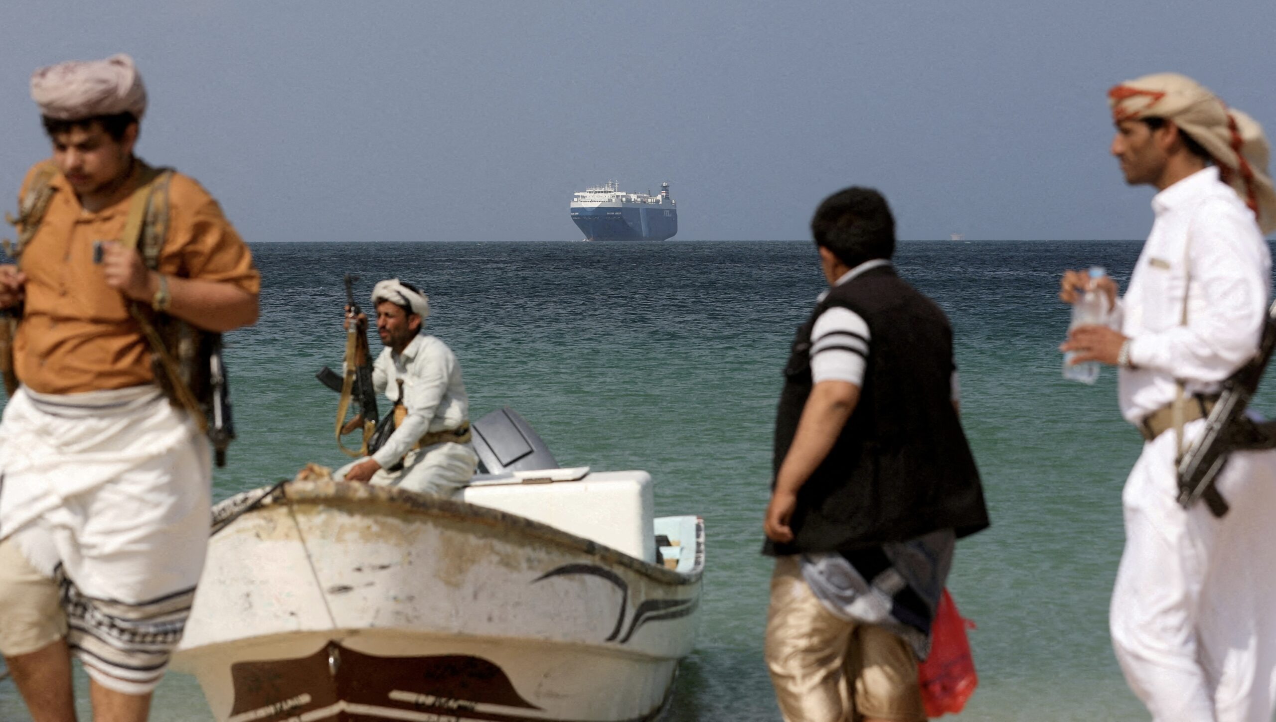 Image: Armed men stand on the beach as the Galaxy Leader commercial ship, seized by Yemen's Houthis last month, is anchored off the coast of al-Salif, Yemen, December 5, 2023. REUTERS/Khaled Abdullah//File Photo
