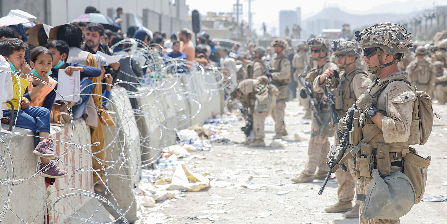 Image: US Marines provide assistance during an evacuation at Hamid Karzai International Airport, in Kabul, Afghanistan on August 20, 2021. Photo via Lance Cpl. Nicholas Guevara/US Marine Corps via REUTERS.