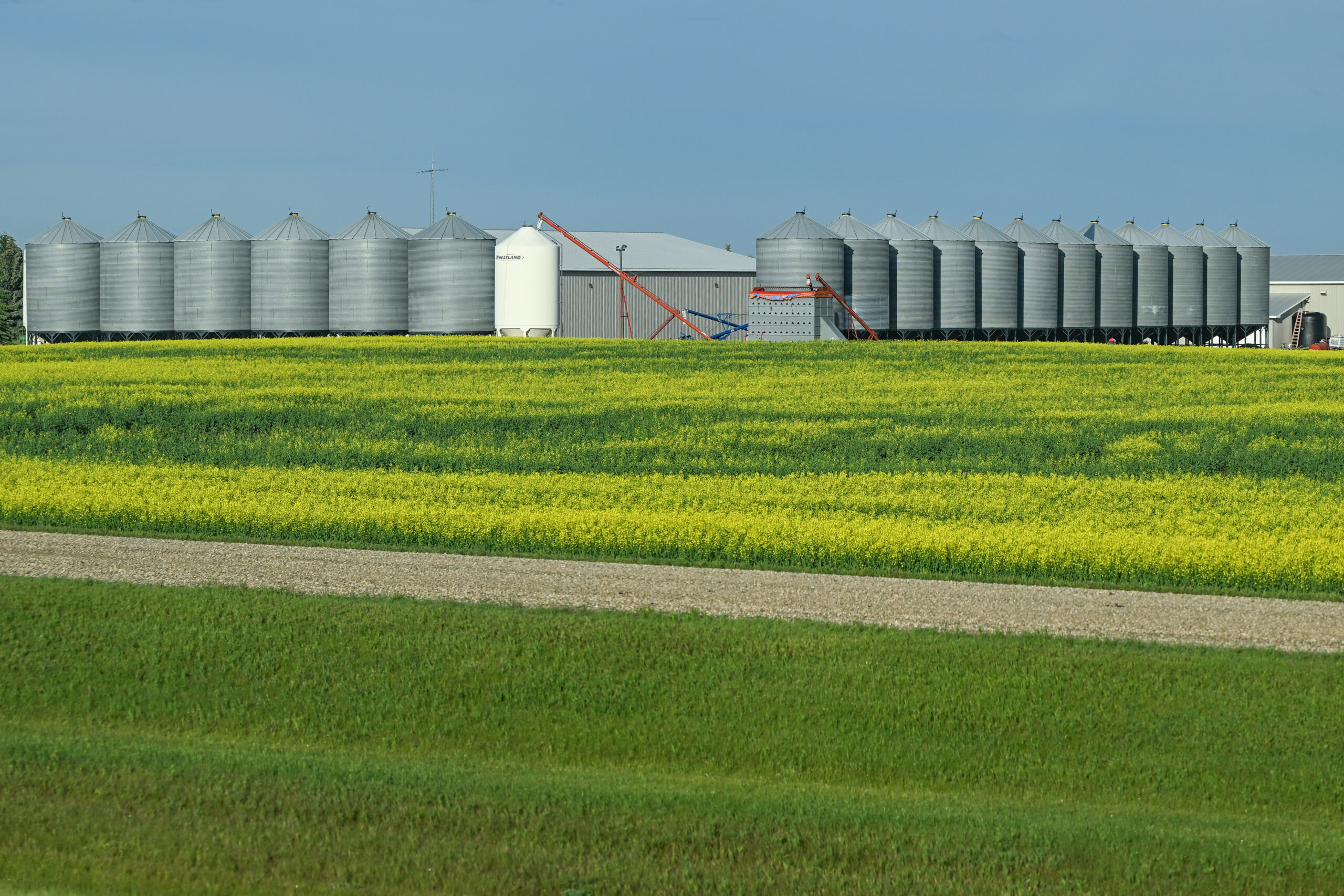 Image: ALBERTA, CANADA – JULY 7: Grain silos rise alongside a yellow canola field along Highway 2 (Queen Elizabeth II Highway) in Alberta, Canada, on July 7, 2025. (Photo by Artur Widak/NurPhoto) REUTERS