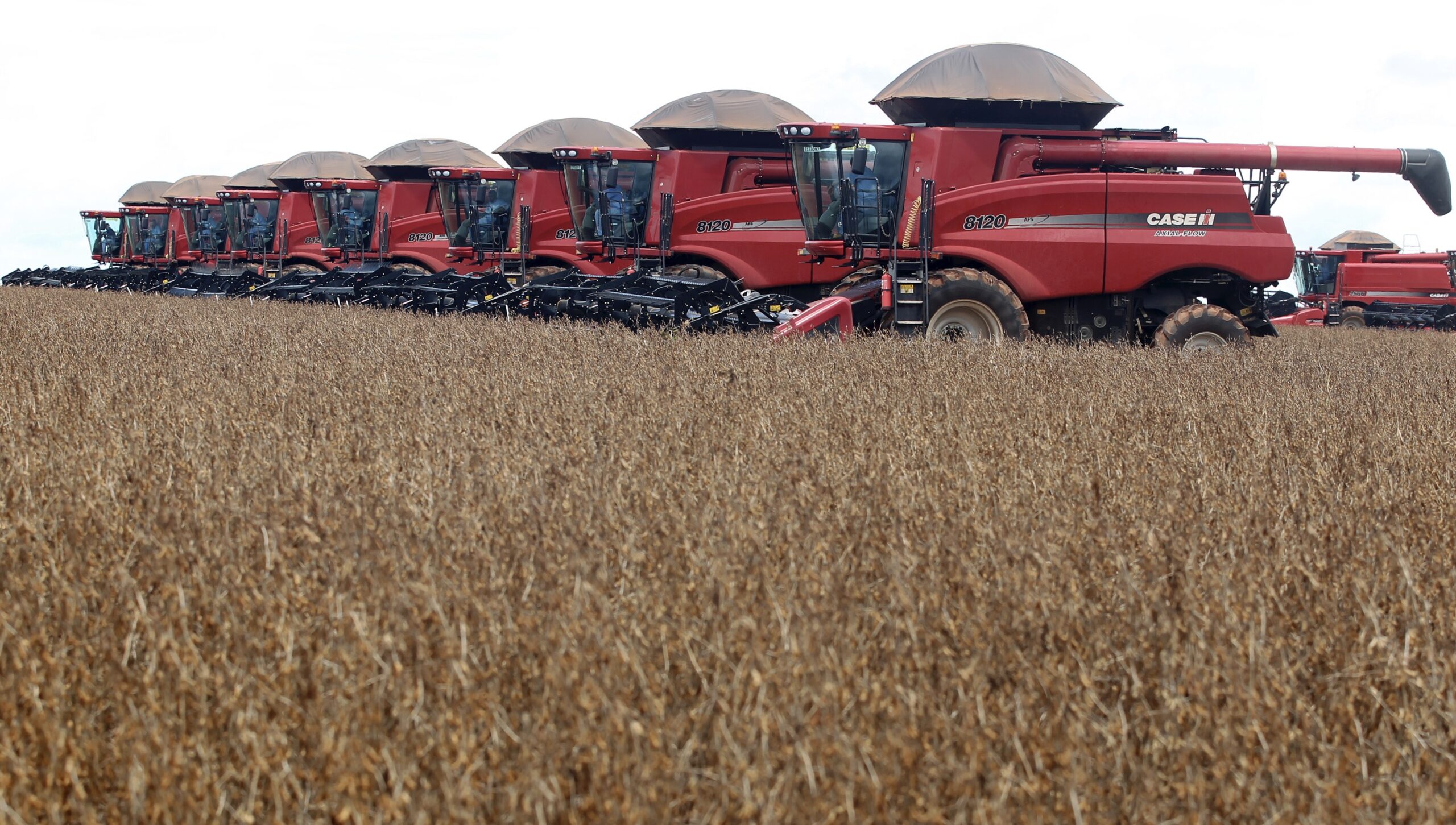 Image: Machines lined up before harvesting soybeans at a farm in Tangara da Serra in Cuiaba March 27, 2012. U.S. soybean futures fell from a six-month high on Tuesday as traders booked profits ahead of highly anticipated crop reports due at the end of the week. REUTERS/Paulo Whitaker