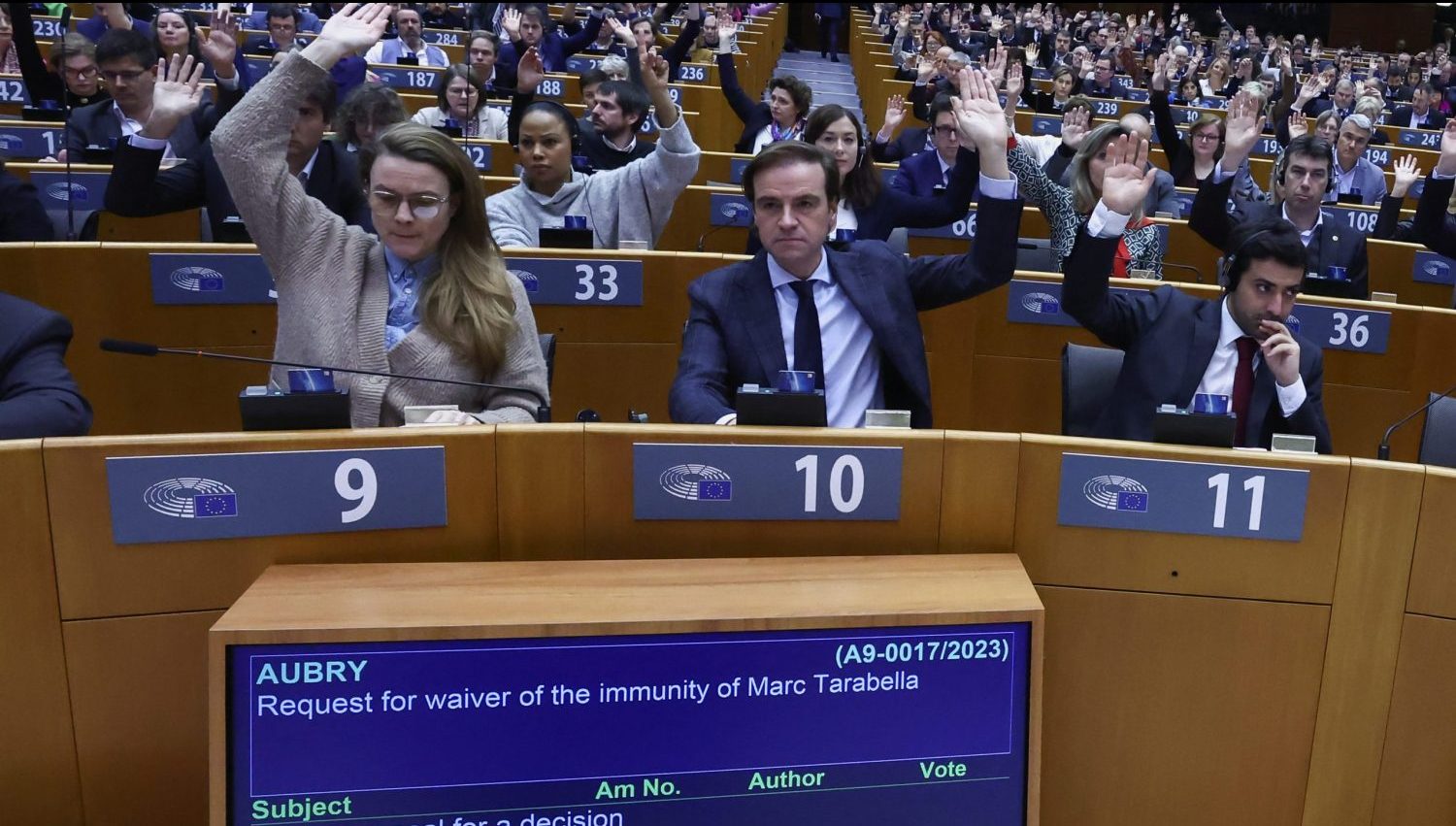 Image: Members of the European Parliament vote on lifting immunity for Italian lawmaker Andrea Cozzolino and Belgian lawmaker Marc Tarabella, both of the centre-left Socialists and Democrats, who Belgian investigators want to question over a cash-for-influence corruption scandal, in Brussels, Belgium February 2, 2023. REUTERS/Yves Herman