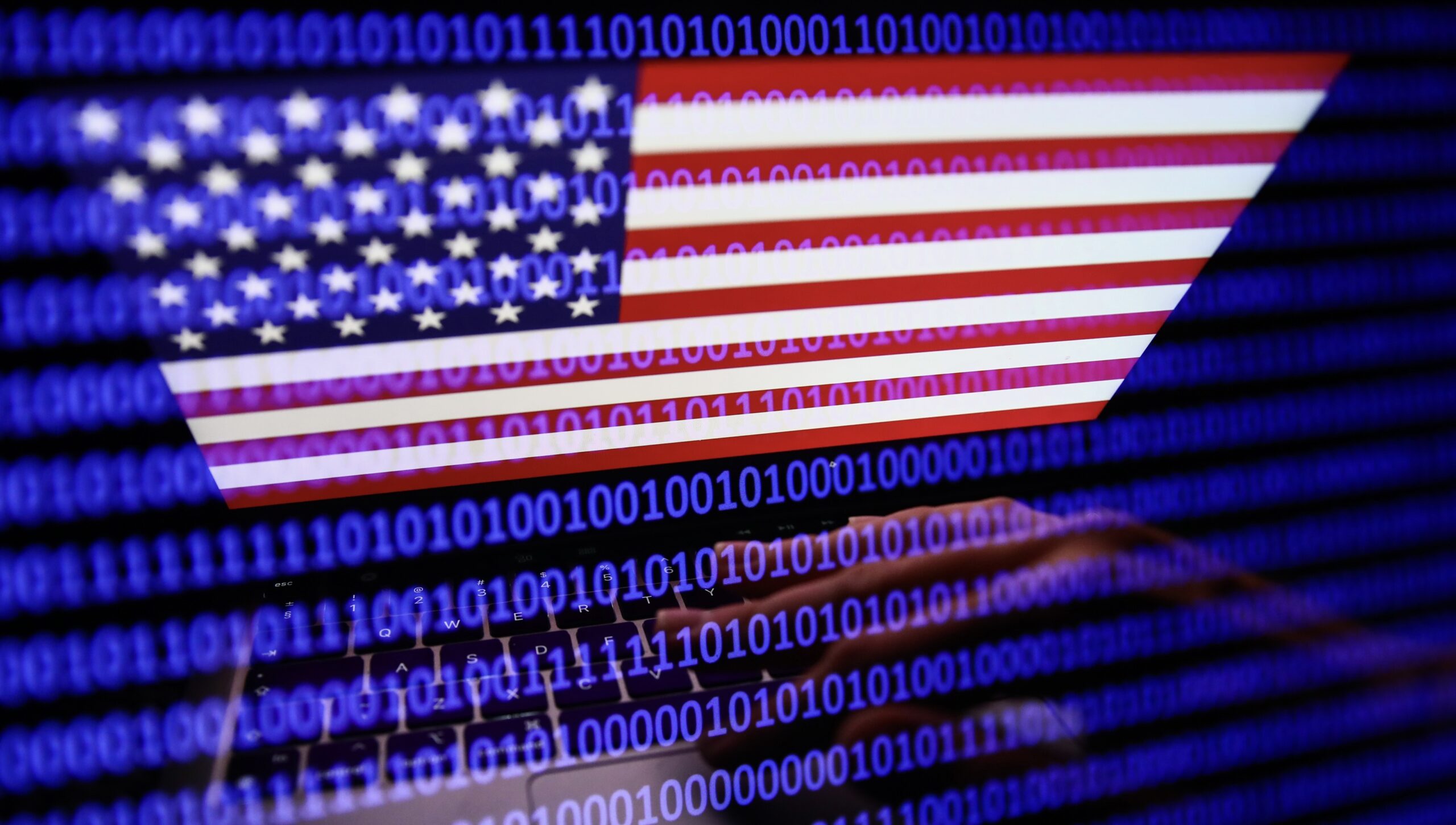 Image: Flag of the United States displayed on a laptop screen and binary code displayed on a screen are seen in this multiple exposure illustration photo taken in Krakow, Poland on September 27, 2022. (Photo by Jakub Porzycki/NurPhoto) REUTERS