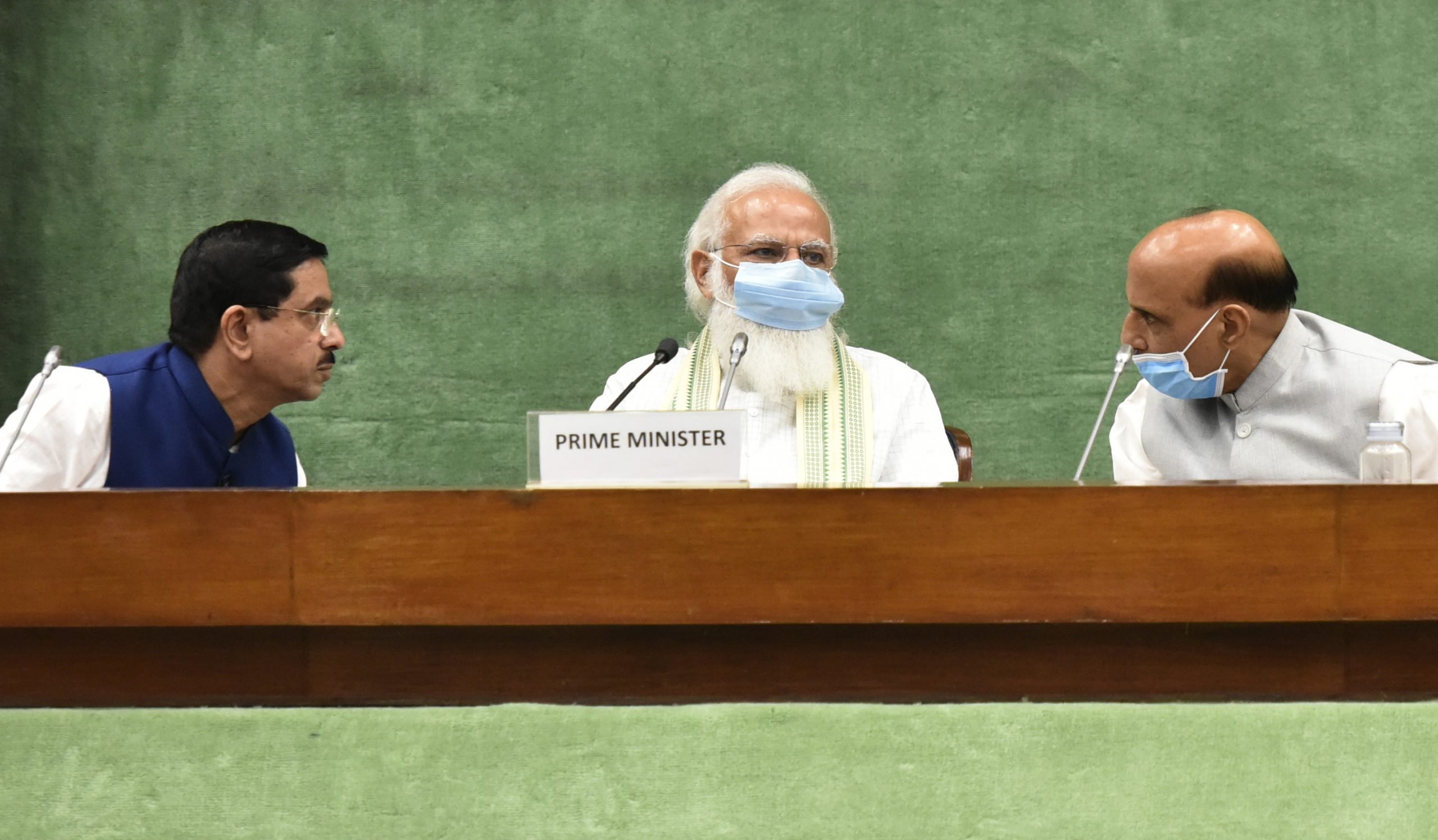 Image: Indian Prime Minister Narendra Modi consults with Defense Minister Rajnath Singh and Parliamentary Affairs Minister Pralhad Joshi, during an all-party meeting in New Delhi on July 18. Photo via Sonu Mehta/Hindustan Times/Sipa USA.