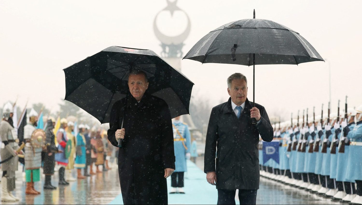 Image: Turkey's President Tayyip Erdogan and Finland?s President Sauli Niinisto review a guard of honour during a welcoming ceremony in Ankara, Turkey March 17, 2023. Murat Cetinmuhurdar/Presidential Press Office/Handout via REUTERS ATTENTION EDITORS - THIS PICTURE WAS PROVIDED BY A THIRD PARTY. NO RESALES. NO ARCHIVES.