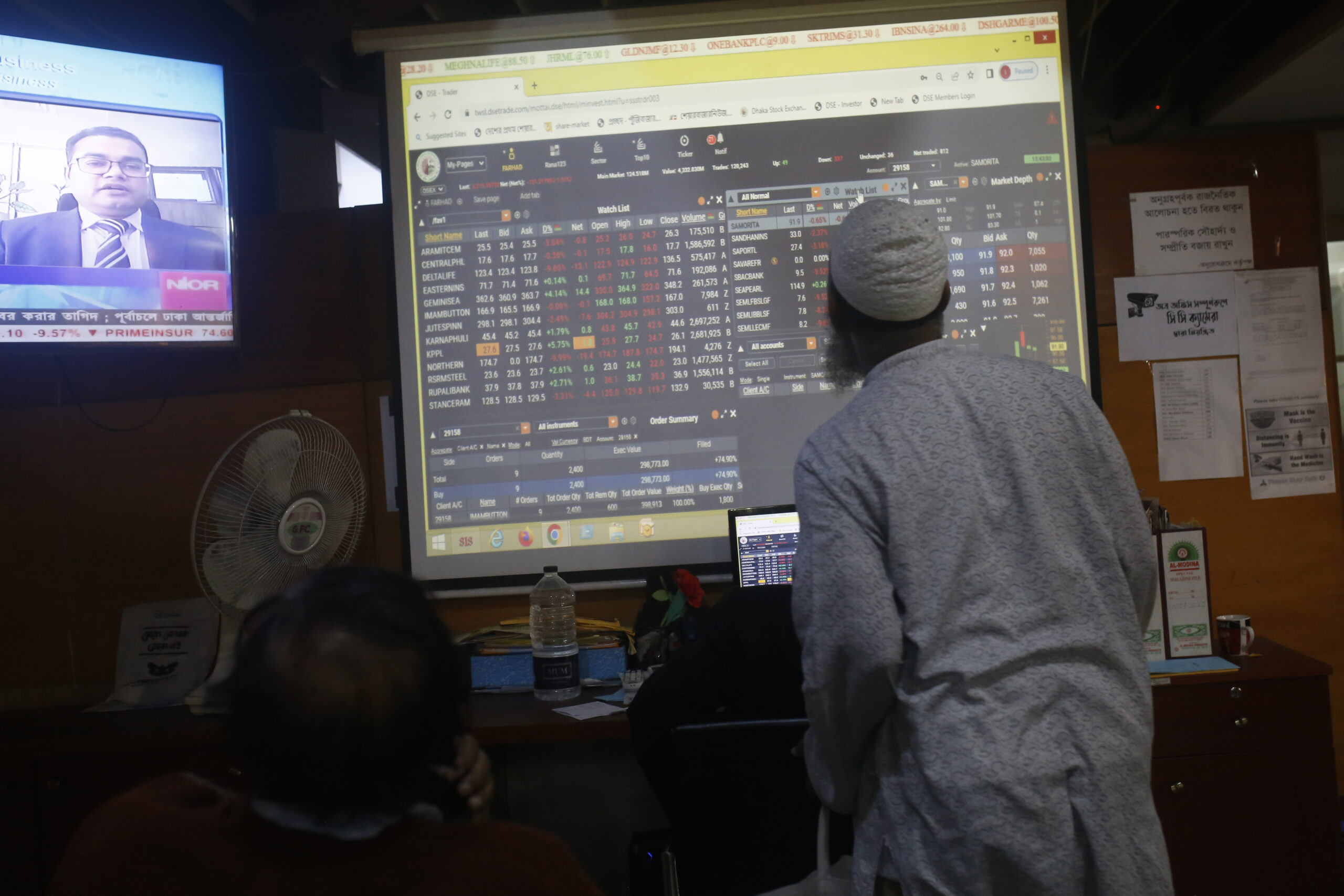 Image: Traders are looking up at a screen during the Dhaka Stock Exchange trading session at a Brokerage House in Dhaka, Bangladesh, on January 21, 2024. Stock prices are plunging after the floor price restrictions were lifted, except for 35 companies in Bangladesh. (Photo by Rehman Asad/NurPhoto)