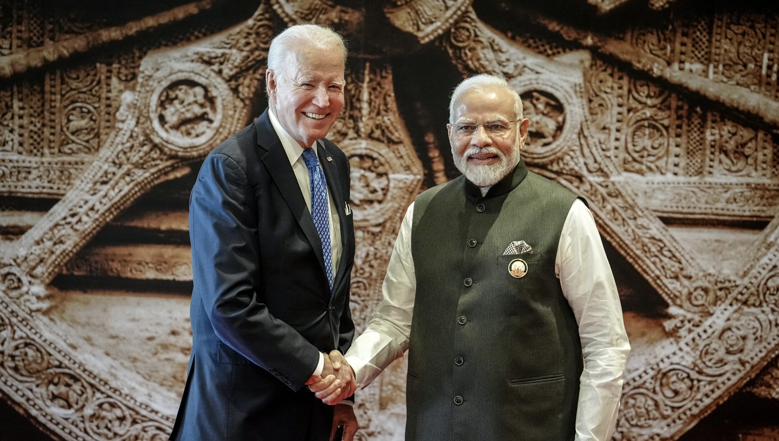 Image: US President Joe Biden is received by Narendra Modi, Prime Minister of India, at the G20 summit. The G20 group includes leading industrialized nations and emerging economies that together account for a large share of the world's population and global economic power.