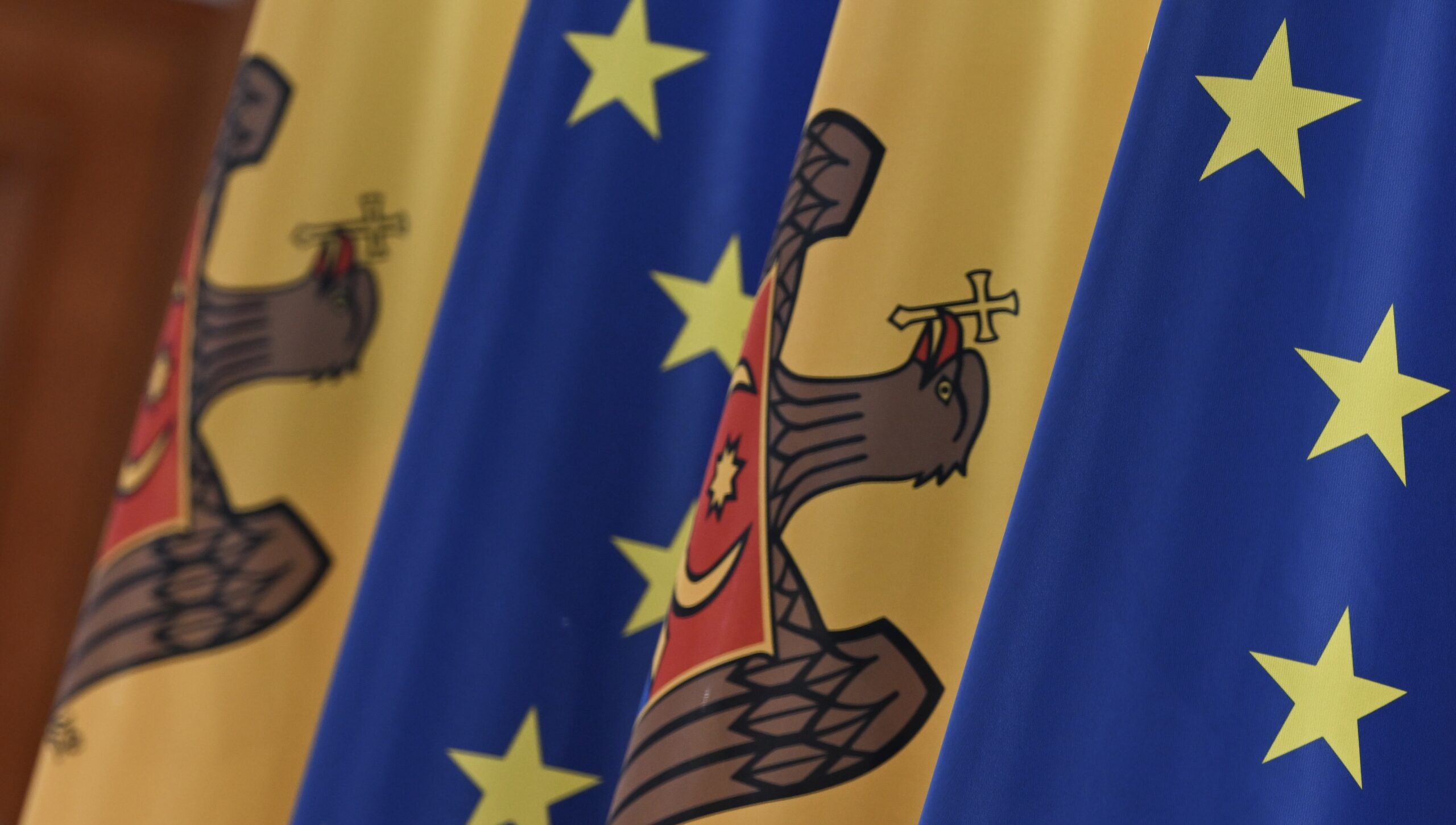 Image: CHISINAU, MOLDOVA - SEPTEMBER 29: Moldovan and EU flags are seen ahead of President Maia Sandu’s address to the media inside the Presidential Palace following the parliamentary election in Chisinau, Moldova, on September 29, 2025. Final results showed the ruling Party of Action and Solidarity (PAS) winning 50.1% of the vote, while the pro-Russian Patriotic Bloc took 24.2%, giving PAS a decisive majority and reinforcing Moldova’s pro-EU path. (Photo by Artur Widak via Reuters Connect)