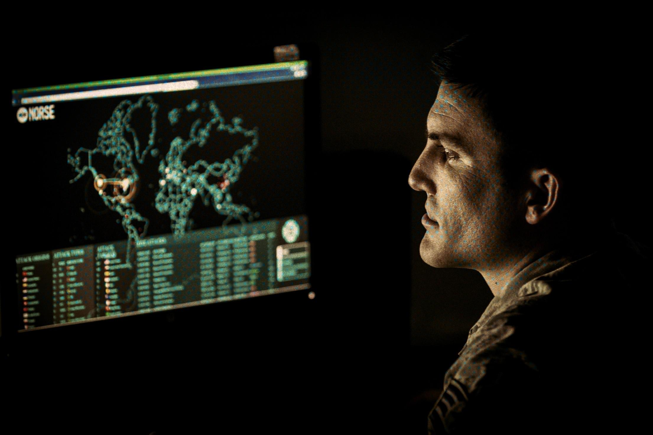 Image: Staff Sgt. Wendell Myler, a cyber warfare operations journeyman assigned to the 175th Cyberspace Operations Group of the Maryland Air National Guard monitors live cyber attacks on the operations floor of the 27th Cyberspace Squadron, known as the Hunter's Den, at Warfield Air National Guard Base, Middle River, Md., June 3, 2017. (US Air Force photo by J.M. Eddins Jr.)