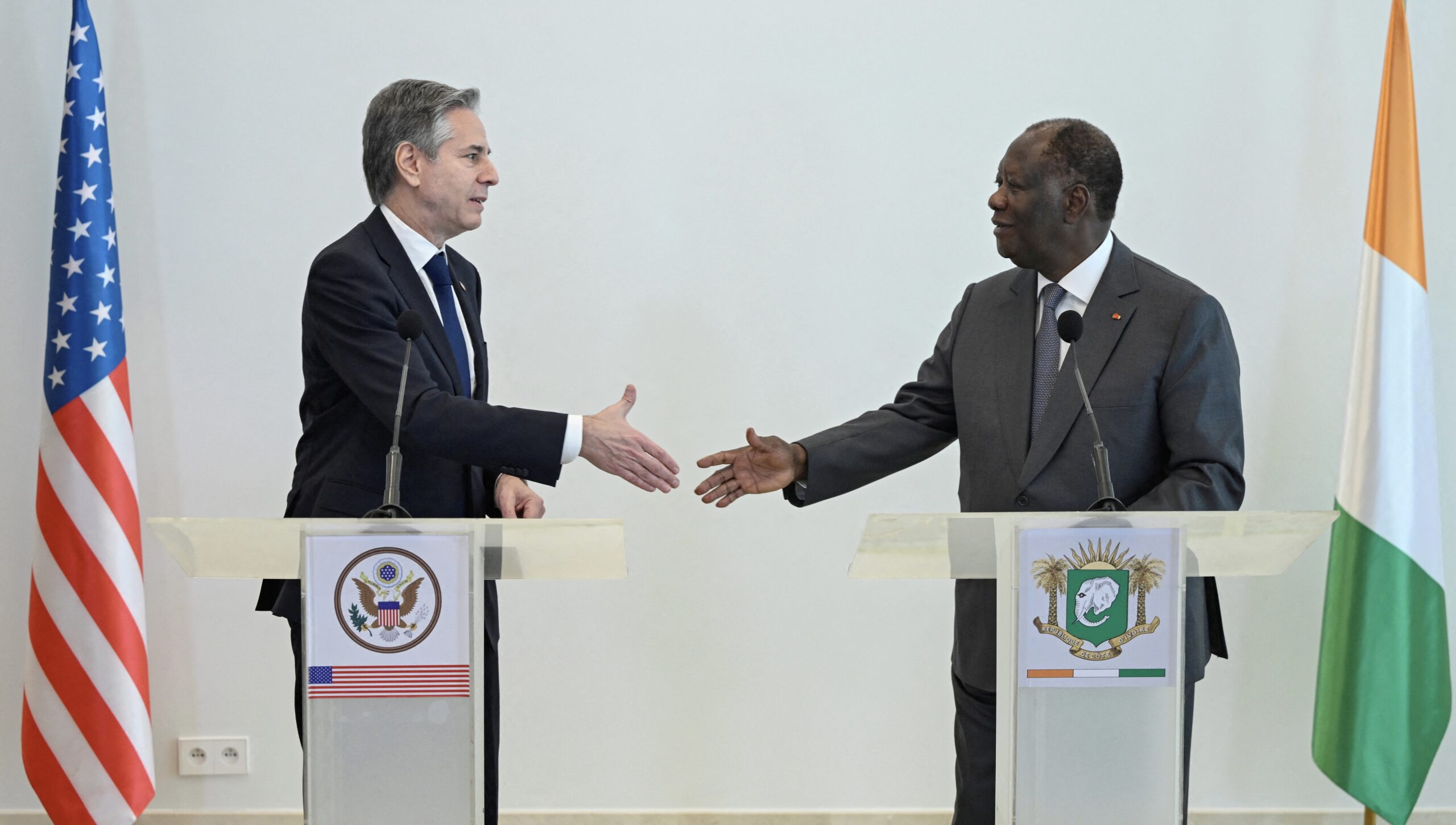 Image: US Secretary of State Antony Blinken and President of Ivory Coast Alassane Ouattara shake hands after they delivered remarks following their meeting at the Residence of President in Abidjan, Ivory Coast on January 23, 2024. ANDREW CABALLERO-REYNOLDS/Pool via REUTERS