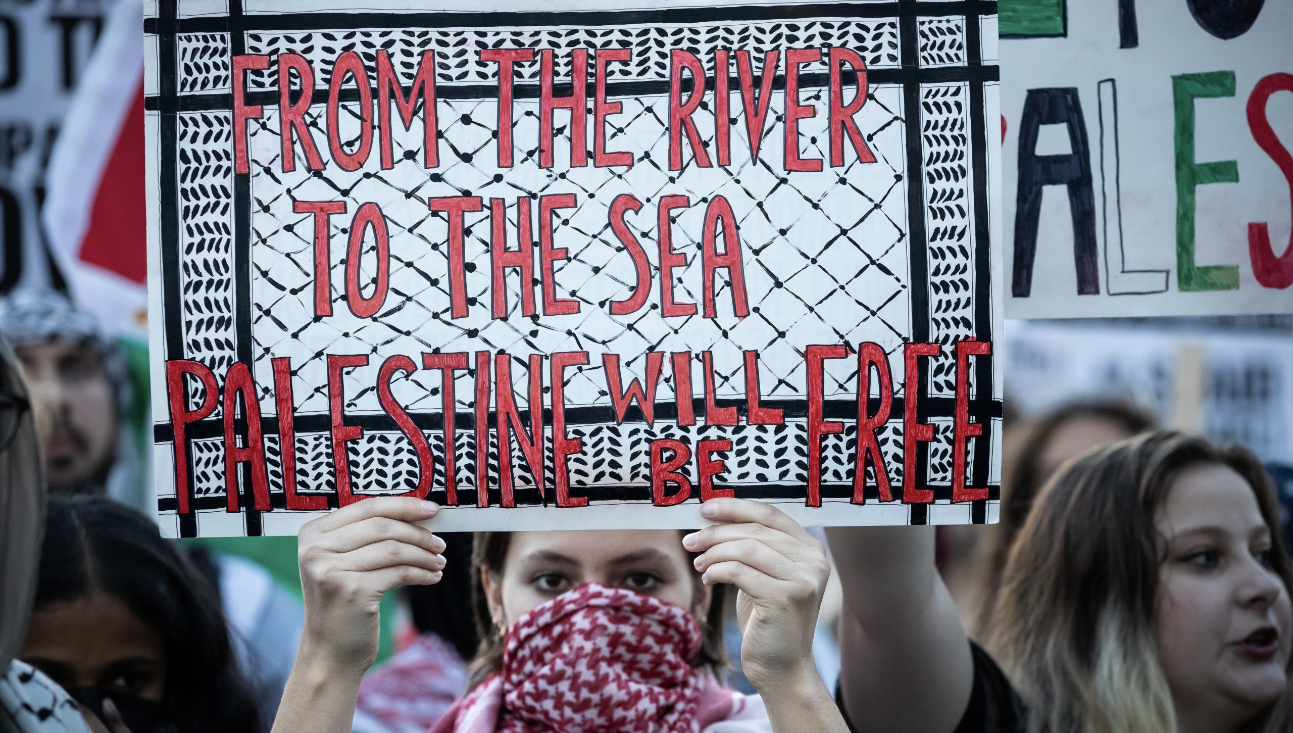 Image: A woman holds a sign with the controversial phrase, "from the river to the sea," at a Washington, DC rally demanding a ceasefire for Palestine. The event was one of hundreds of protests worldwide demanding an end to the bombing of civilians in retaliation for the Hamas terror attacks that killed 1,400 Israelis on October 7, 2023. (Photo by Allison Bailey/NurPhoto)