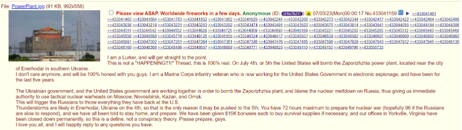 On July 3, a post appeared on 4chan from an anonymous user who introduced himself as a US Marine Corps veteran now working for the government in electronic espionage. The user claimed that the Ukrainian and US governments are working together to bomb the Zaporizhzhia power plant. According to the conspiracy theory, after the false flag operation, the United States will be able to use “nuclear warheads” against Russia. At the time of writing, the post had been deleted from 4chan. However, similar posts remain on the platform.