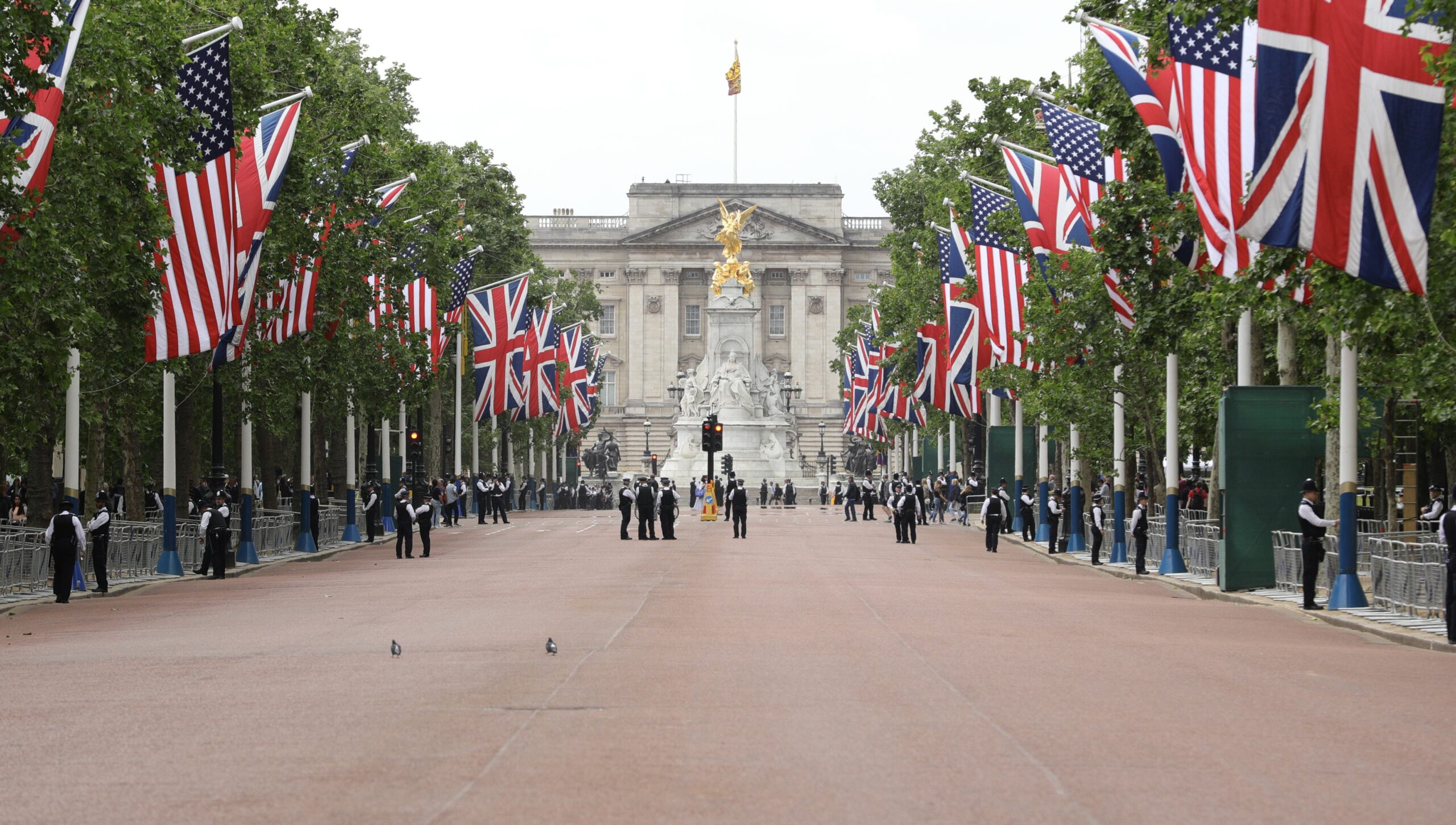 Image: Police officers line The Mall near Buckingham Palace, London, during the first day of US President Donald Trump's state visit to the UK.