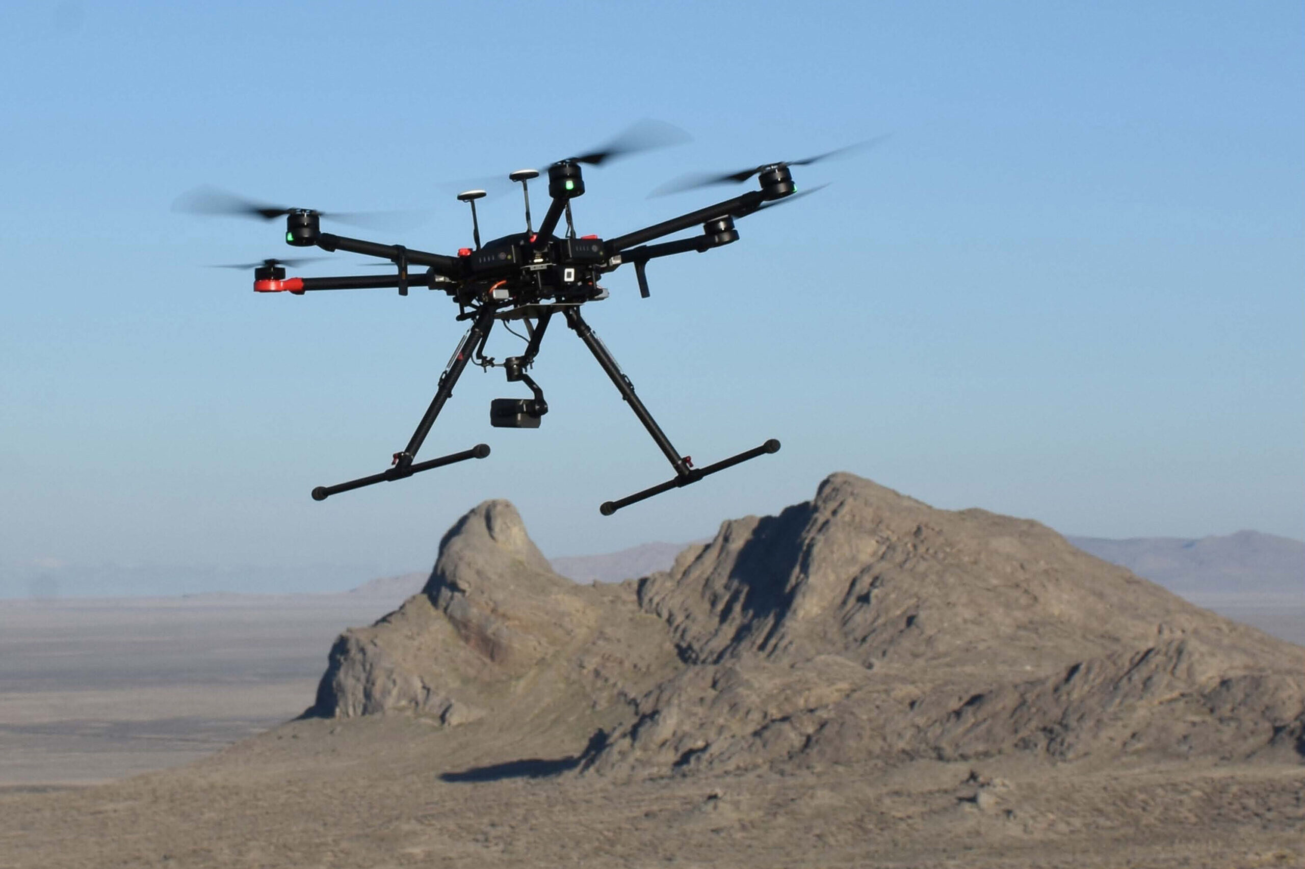 Image: A small unmanned aircraft system (sUAS) is shown in flight at Dugway Proving Ground. The sUAS is one of three platforms utilized during a two-year study to locate golden eagle nests on the installation. The study was conducted to determine which platform worked best. Dugway Proving Ground photo.