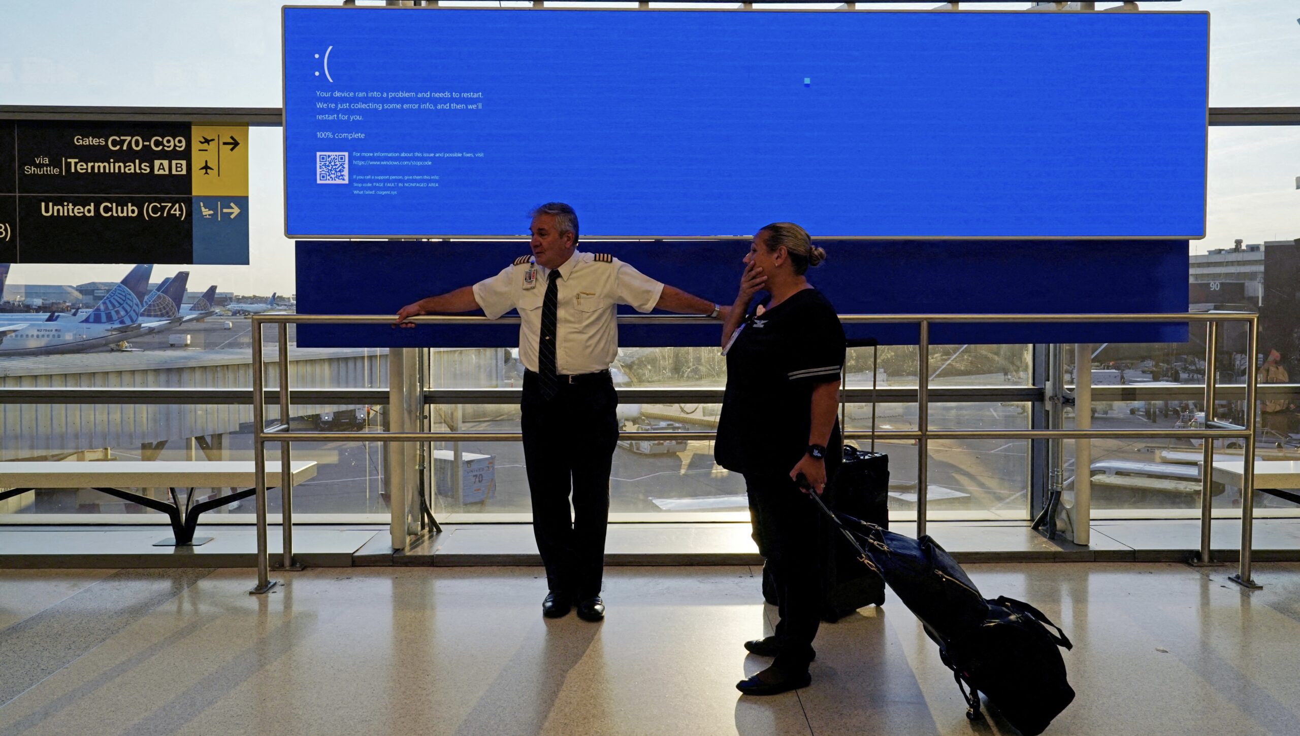 Image: United Airlines employees wait by a departures monitor displaying a blue error screen, also known as the “Blue Screen of Death” inside Terminal C in Newark International Airport, after United Airlines and other airlines grounded flights due to a worldwide tech outage caused by an update to CrowdStrike's "Falcon Sensor" software which crashed Microsoft Windows systems, in Newark, New Jersey, U.S., July 19, 2024. REUTERS/Bing Guan