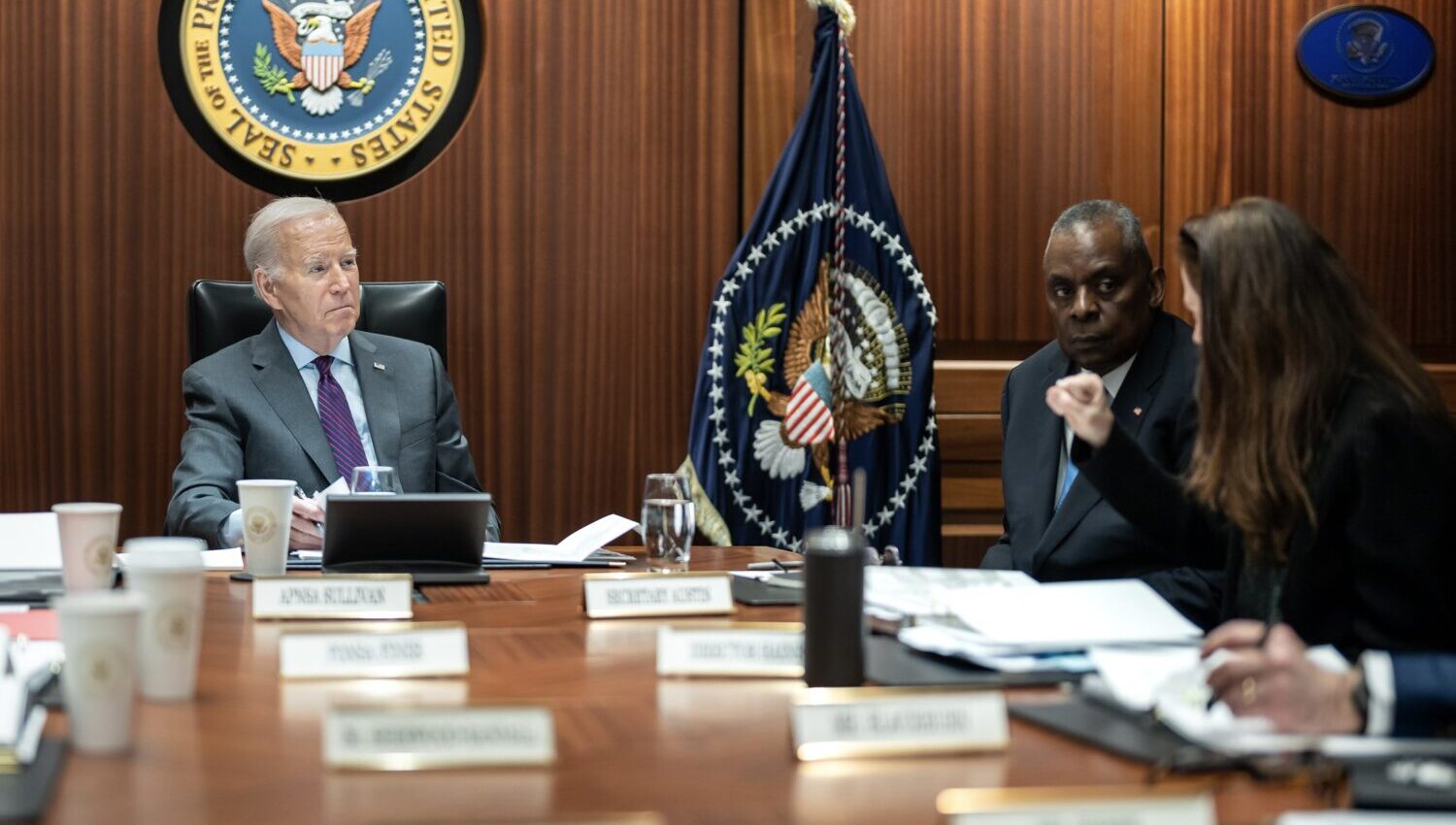 Image: U.S President Joe Biden is briefed by members of the national security team in the Situation Room on Monday Jan 29, 2024 on the latest developments regarding the attack on U.S. service members in northeastern Jordan on Saturday night Jan 27, 2024. A drone has struck a tent of sleeping troops in Jordan, killing US troops in the Middle East for the first time since the war in Gaza began. The US has blamed Iran-backed militant groups, but is yet to identify who specifically they believe is responsible. US President Joe Biden said the attack was carried out by radical Iran-backed militant groups in Syria and Iraq on Saturday night.