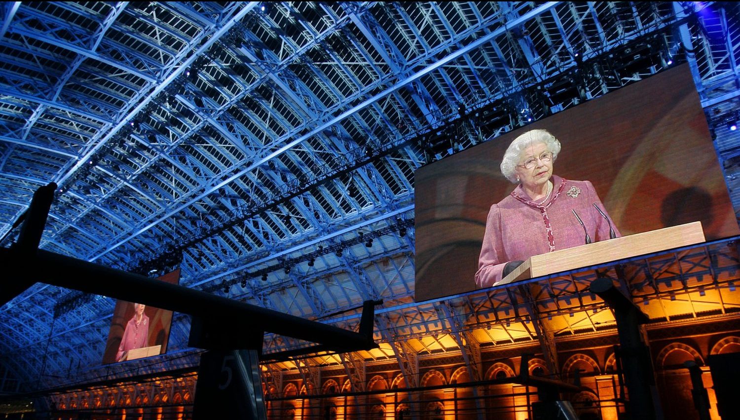 Image: A screen shows Queen Elizabeth ll giving a speech to officially open St Pancras International Station, the new home to Eurostar, in London.No Use UK. No Use Ireland. No Use Belgium. No Use France. No Use Germany. No Use Japan. No Use China. No Use Norway. No Use Sweden. No Use Denmark. No Use Holland