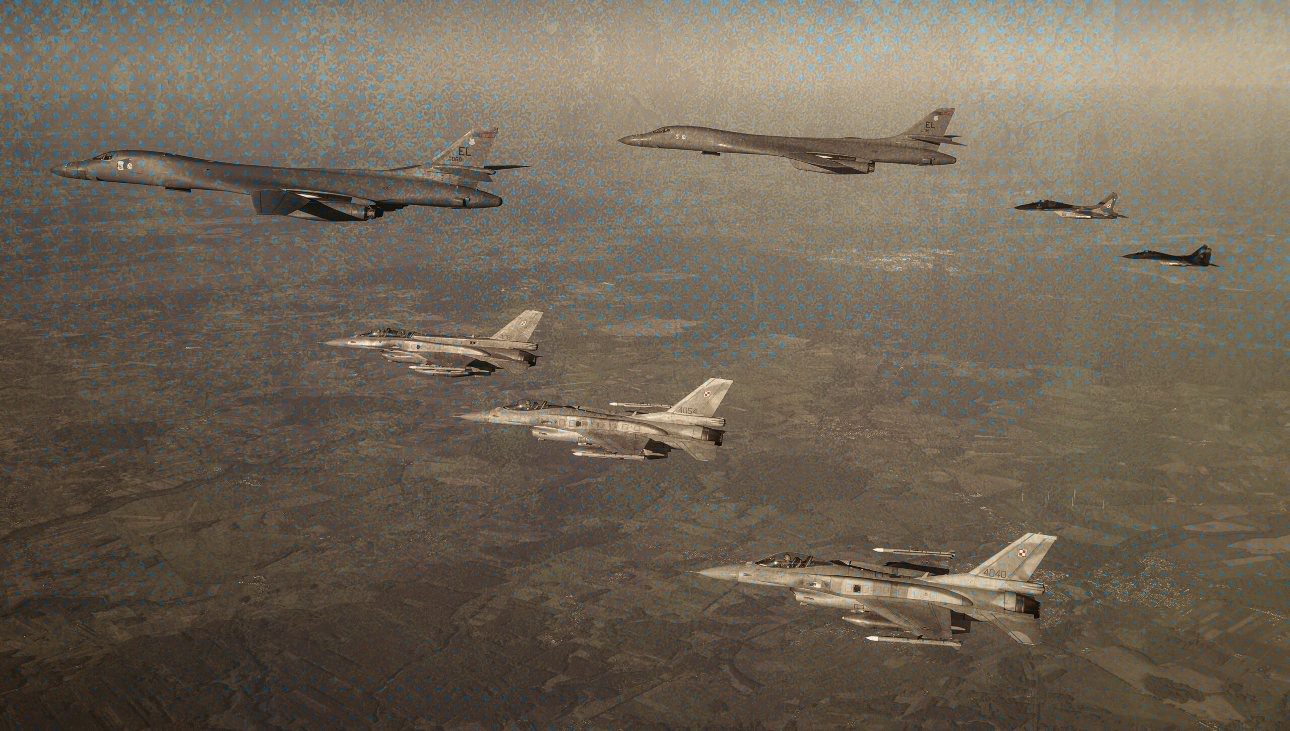 Image: Polish F-16s and MiG-29s escort a B1B Lancer during a training mission for Bomber Task Force Europe, May 29, 2020. Aircrews from the 28th Bomb Wing at Ellsworth Air Force Base, South Dakota, took off on their long-range, long-duration Bomber Task Force mission to conduct interoperability training in the Black Sea region. Courtesy photo by Polish Air Force.