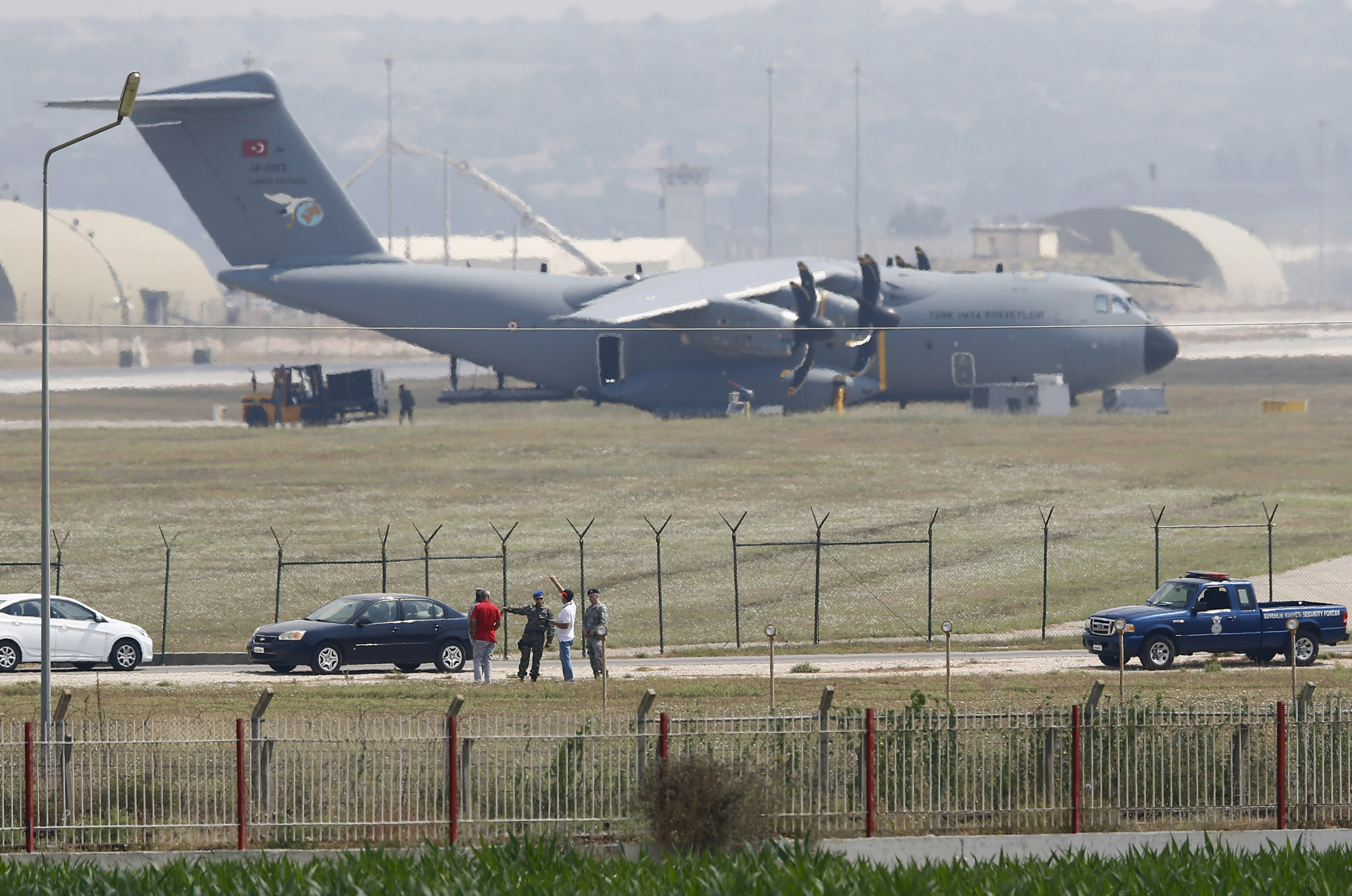 Image: Turkish and US soldiers, with a Turkish Air Force A400M tactical transport aircraft in the background, conduct inspections inside Incirlik airbase in the southern city of Adana, Turkey, July 27. Turkey attacked Kurdish insurgent camps in Iraq for a second night July 26, security sources said, in a campaign that could end its peace process with the Kurdistan Workers Party (PKK). (Reuters/Murad Sezer)