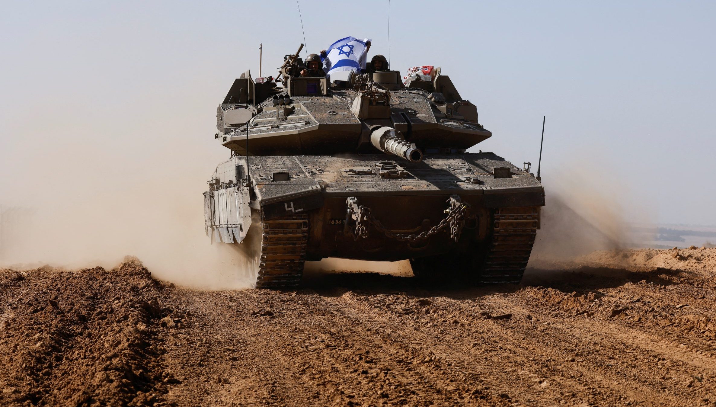 Image: Israeli soldiers hold an Israeli flag, as they ride in a Merkava tank, near Israel's border after leaving Gaza, during the temporary truce between the Palestinian Islamist group Hamas and Israel, in Israel, November 24, 2023. REUTERS/Amir Cohen