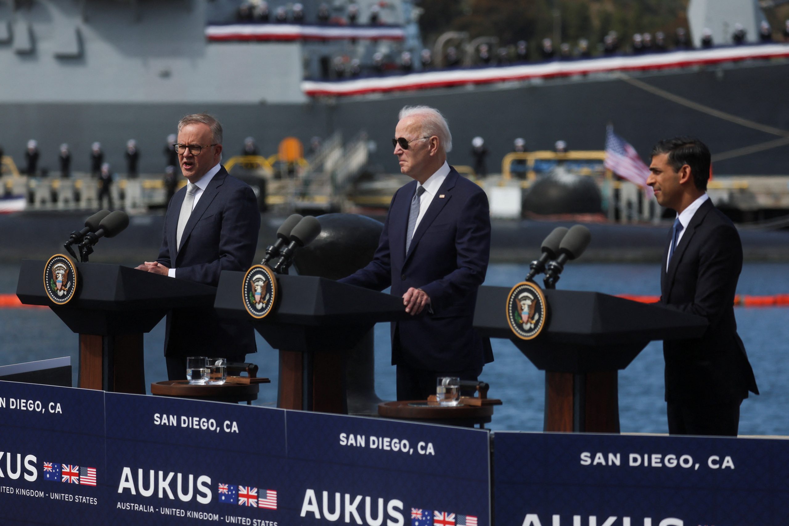 Image: US President Joe Biden, Australian Prime Minister Anthony Albanese and British Prime Minister Rishi Sunak deliver remarks on the Australia - United Kingdom - U.S. (AUKUS) partnership, after a trilateral meeting, at Naval Base Point Loma in San Diego, California.