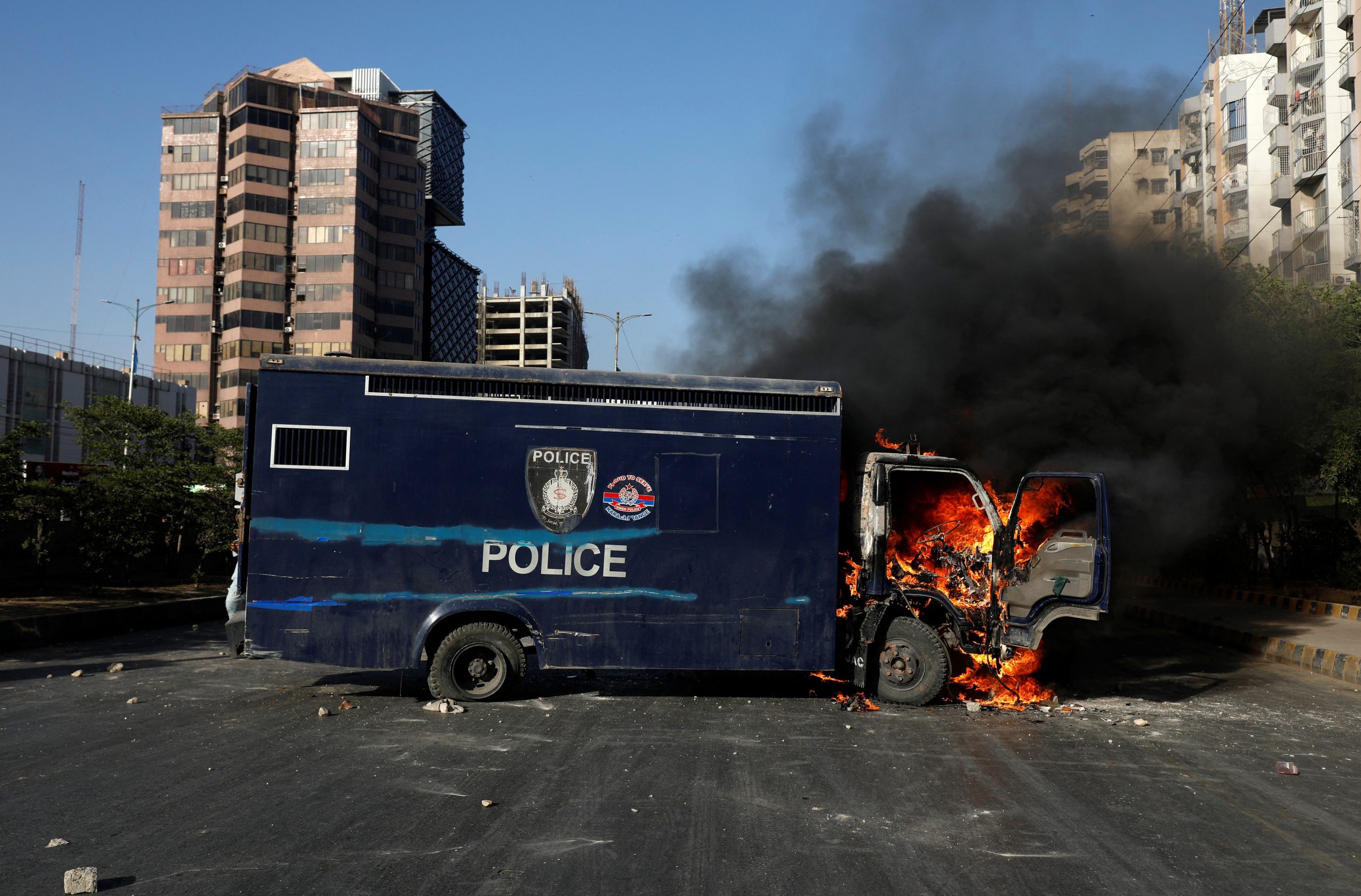 Image: A police vehicle burns during a protest by the supporters of Pakistan's former Prime Minister Imran Khan after his arrest, in Karachi, Pakistan, May 9, 2023. REUTERS/Akhtar Soomro