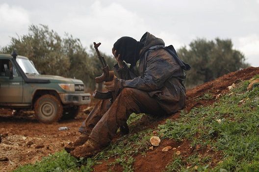 Image: Photo: February 19, 2015 A rebel fighter of al-Jabha al-Shamiya (the Shamiya Front) covered with mud carries his weapon as he sits near the front line with Bashkuwi village, north of Aleppo February 19, 2015. Battles in and around the Syrian city of Aleppo have killed at least 70 pro-government fighters and more than 80 insurgents after the army launched an offensive there, a monitoring group said on Wednesday. REUTERS