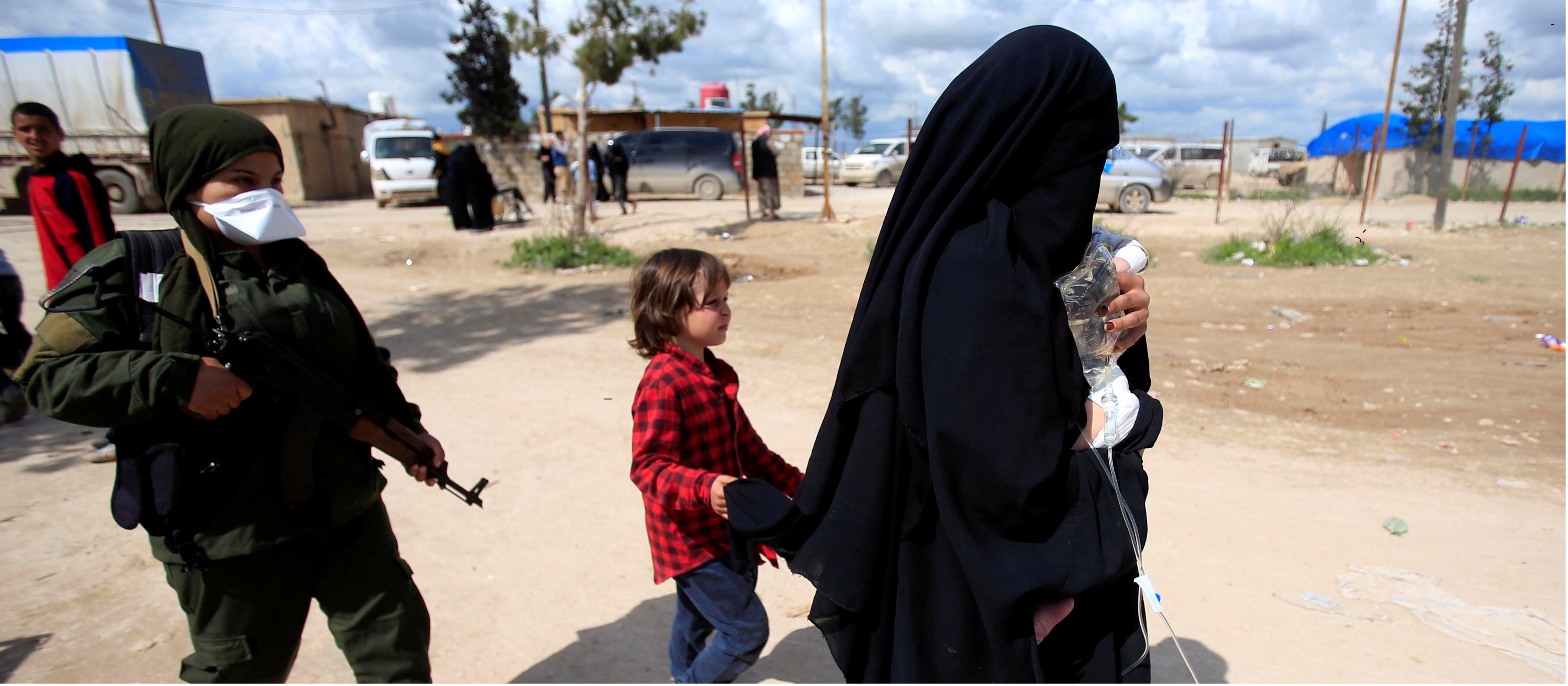 Image: A fighter of Syrian Democratic Forces (SDF) walks with the wife of an Islamic State fighter, who holds her sick baby, at al-Hol displacement camp in Hasaka governorate, Syria April 1, 2019. Picture taken April 1, 2019. REUTERS/Ali Hashisho