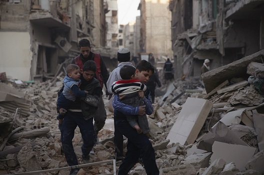 Image: (Photo: Youths carry children through a site damaged from what activists said was shelling by forces loyal to Syria's President Bashar al-Assad in the town of Douma, eastern Ghouta in Damascus, Syria December 30, 2015. REUTERS/Bassam Khabieh)