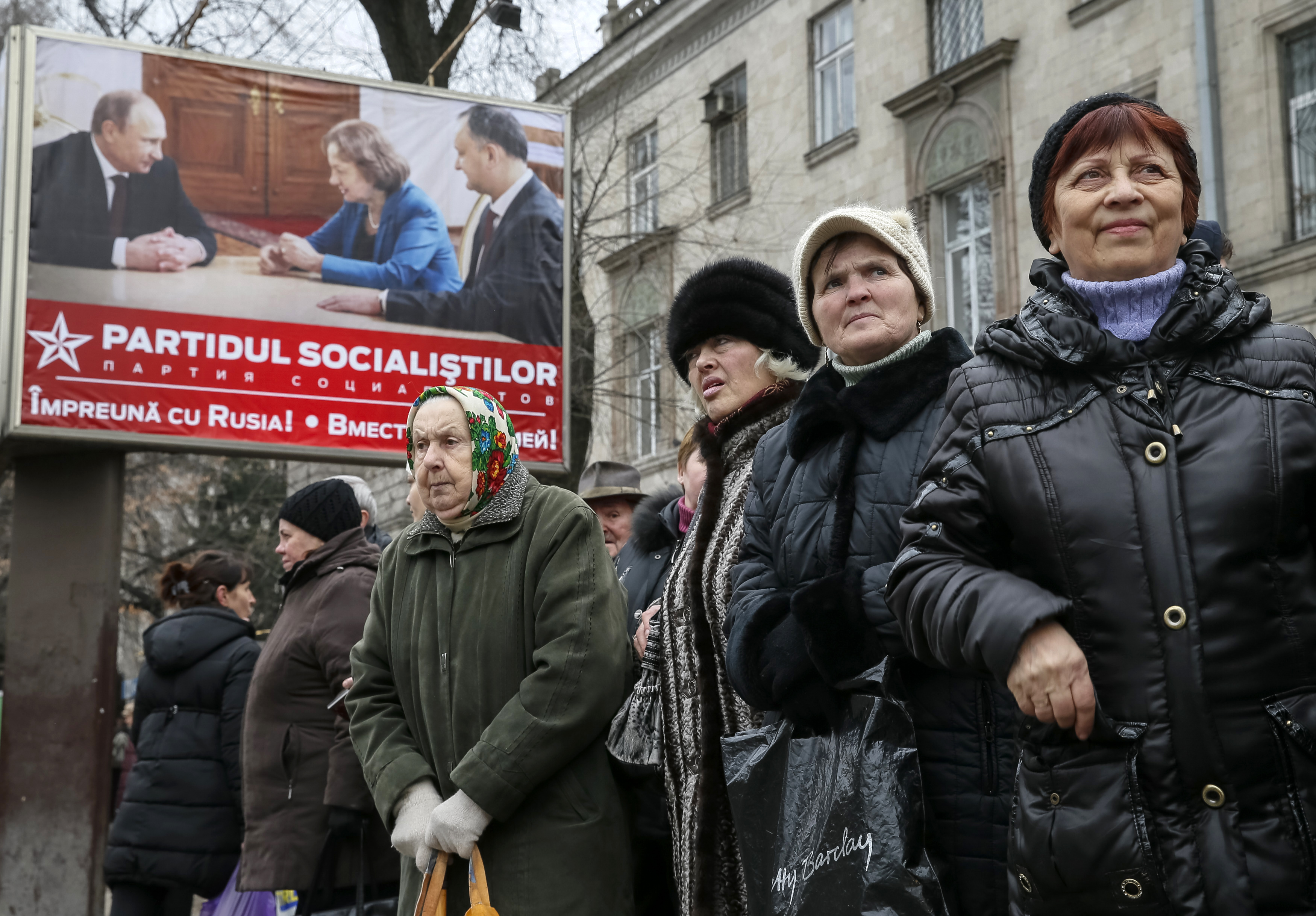Image: The day before the November 30 election, Moldovan women wait for a trolley in the capital, Chisinau, beneath a Socialist Party billboard that shows party leaders meeting Russian President Vladimir Putin. "Together with Russia!" the billboard proclaims. (Reuters/Gleb Garanich)