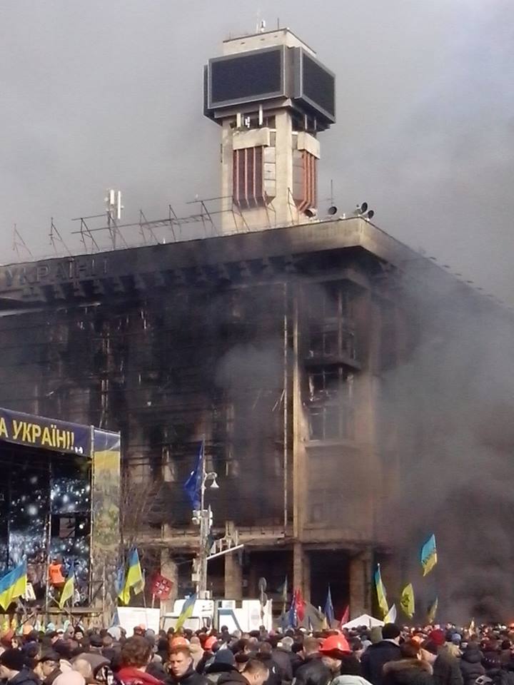 Smoke billows out of the Trade Union Building in Kyiv, Ukraine, on February 19, 2014. Credit: Paul Niland.