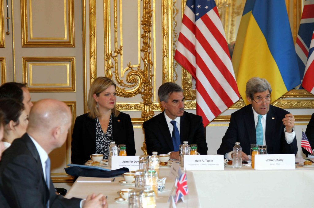 Image: US Secretary of State John Kerry hosts the Budapest Memorandum Ministerial on the Ukraine crisis with former Ukrainian Foreign Minister Andrii Deshchytsia and former British Foreign Secretary William Hague (left) at US ambassador's residence in Paris, France, on March 5, 2014. Credit: State Department photo