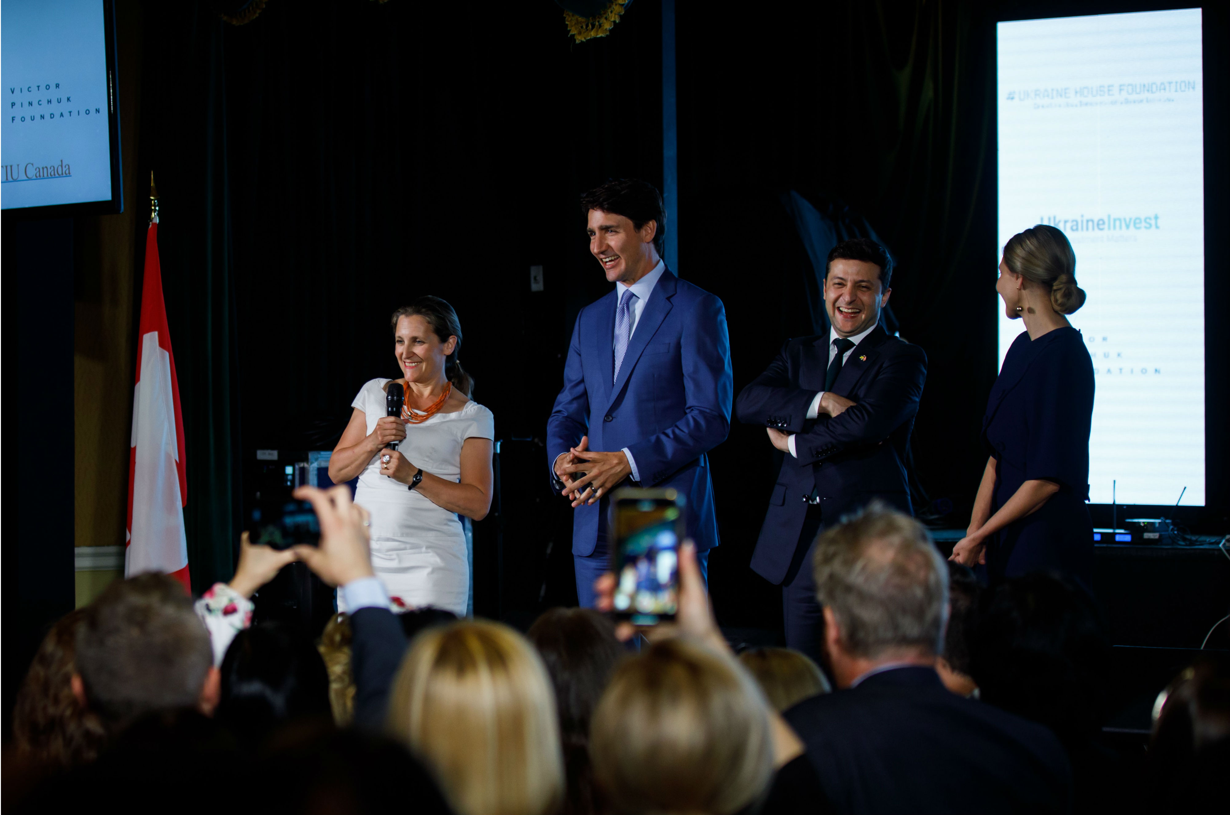 Image: Canadian Foreign Minister Chrystia Freeland and Prime Minister Justin Trudeau welcome Ukrainian President Volodymyr Zelenskyy and his wife Olena to Ukraine House Toronto on July 2. Credit: Ukraine House Toronto