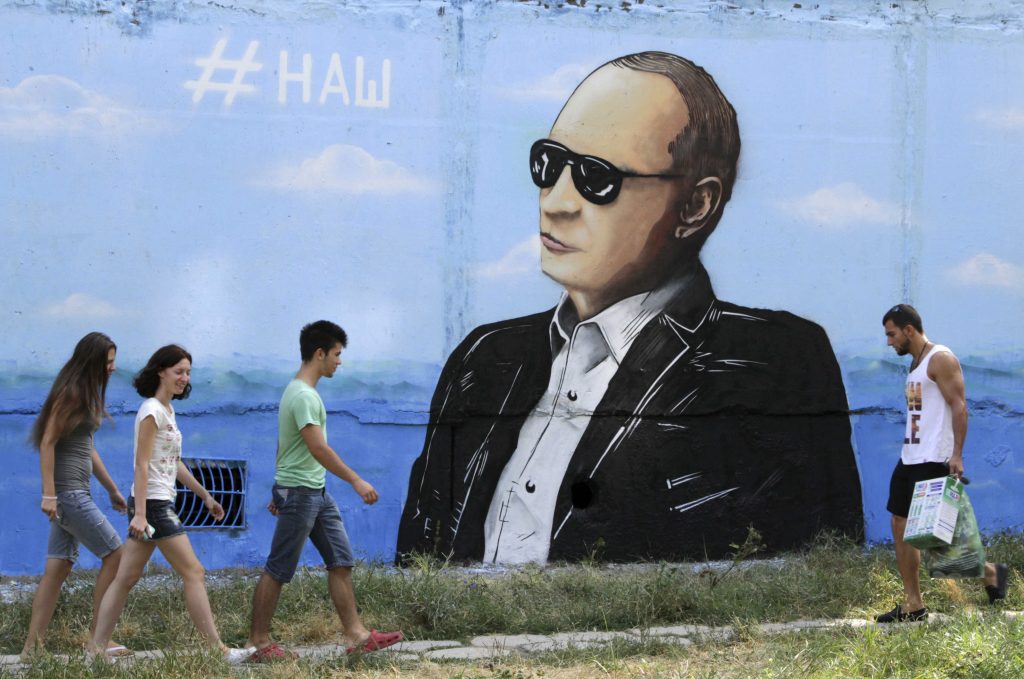 Image: People walk past a graffiti depicting Russian President Vladimir Putin seen on a residential building in Simferopol, Crimea, August 19, 2015. The sign on the graffiti reads "Ours." REUTERS/Pavel Rebrov