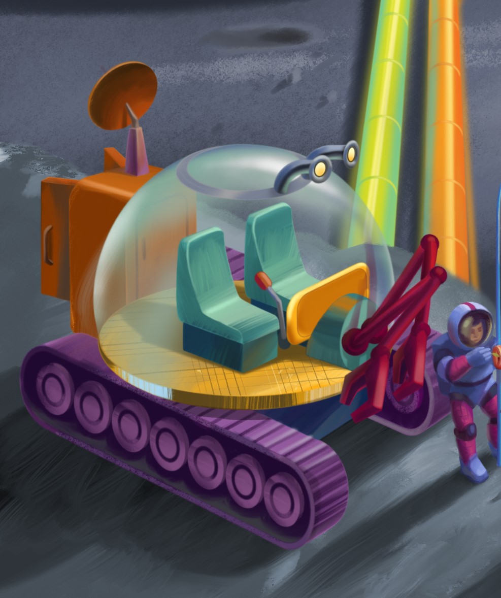 In no time she repairs her transport and whizzes off to the extraterrestrial terrain park. No one can match her speed and skill and Louise comes home much later with a dirty transport and a satisfied smile.