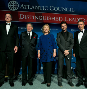The final award for Distinguished International Leadership was presented to former First Lady, US Senator, and US Secretary of State Hillary Clinton. Secretary Clinton was presented with video tributes by President of Malawi Joyce Banda and internationally-renowned political activist Aung San Suu Kyi. She was introduced in person by former Secretary of State and National Security Advisor Dr. Henry Kissinger. Secretary Clinton accepted her award and delivered brief remarks on the state of the transatlantic alliance and the three primary challenges facing NATO in the coming decades: energy security, trade cooperation, and conflict readiness. Secretary Clinton seized the opportunity to endorse a comprehensive transatlantic trade agreement, and to stress that all members of NATO must redouble their efforts to promote transatlantic values around the world. “We cannot afford to let the greatest alliance in history slide into military irrelevance,” she urged.