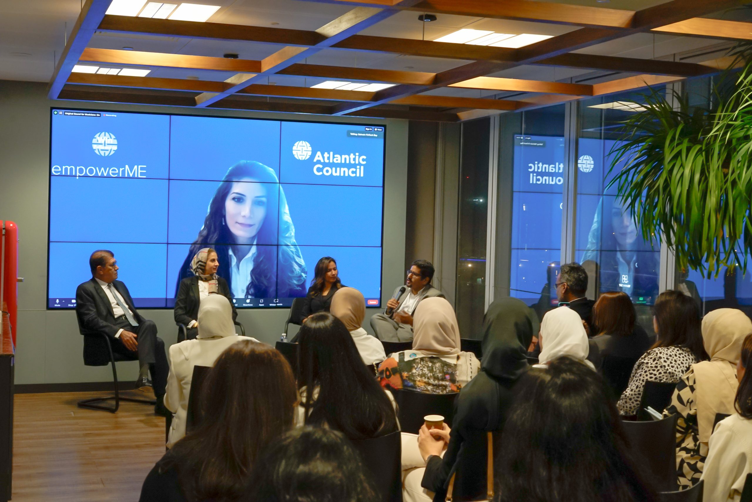 Lynn Monzer, associate director of the Atlantic Council’s WIn Fellowship initiative, offered the opening remarks. The panel included Bader Sater, the chief executive officer of Bahrain FinTech Bay; Noora Al-Nusuf, head of corporate affairs for the Middle East at Standard Chartered Bank; Jamal Fakhro, managing partner of KPMG in Bahrain; and Batool Alkhaja, director of public policy at Rain Management with Lynn Monzer moderating.