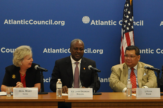 Continuing the Atlantic Council’s series of high-level events around the US-Africa Leaders Summit, the Africa Center hosted H.E. John Dramani Mahama, president of the Republic of Ghana, for a roundtable discussion. Africa Center Director Dr. J. Peter Pham welcomed the Ghanaian delegation that included Ghana’s Minister of Foreign Affairs and Regional Integration H.E. Hanna Tetteh, Minister for Finance and Economic Planning H.E. Seth Terkper, and Minister for Employment and Labour Relations H.E. Haruna Iddrisu. He also acknowledged the presence of several Atlantic Council Board Directors, including General James L. Jones, Jr., chairman of the Brent Scowcroft Center on International Security, and Michael S. Ansari.