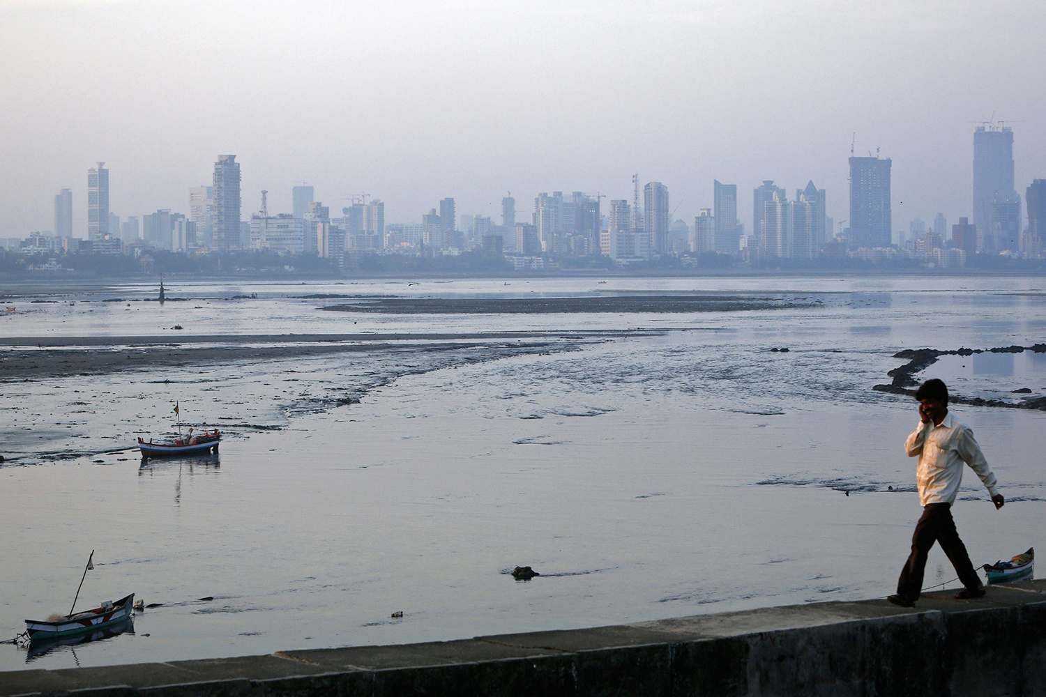 Image: A man walks along a wall overlooking the central Mumbai financial district skyline February 28, 2013. REUTERS/Vivek Prakash