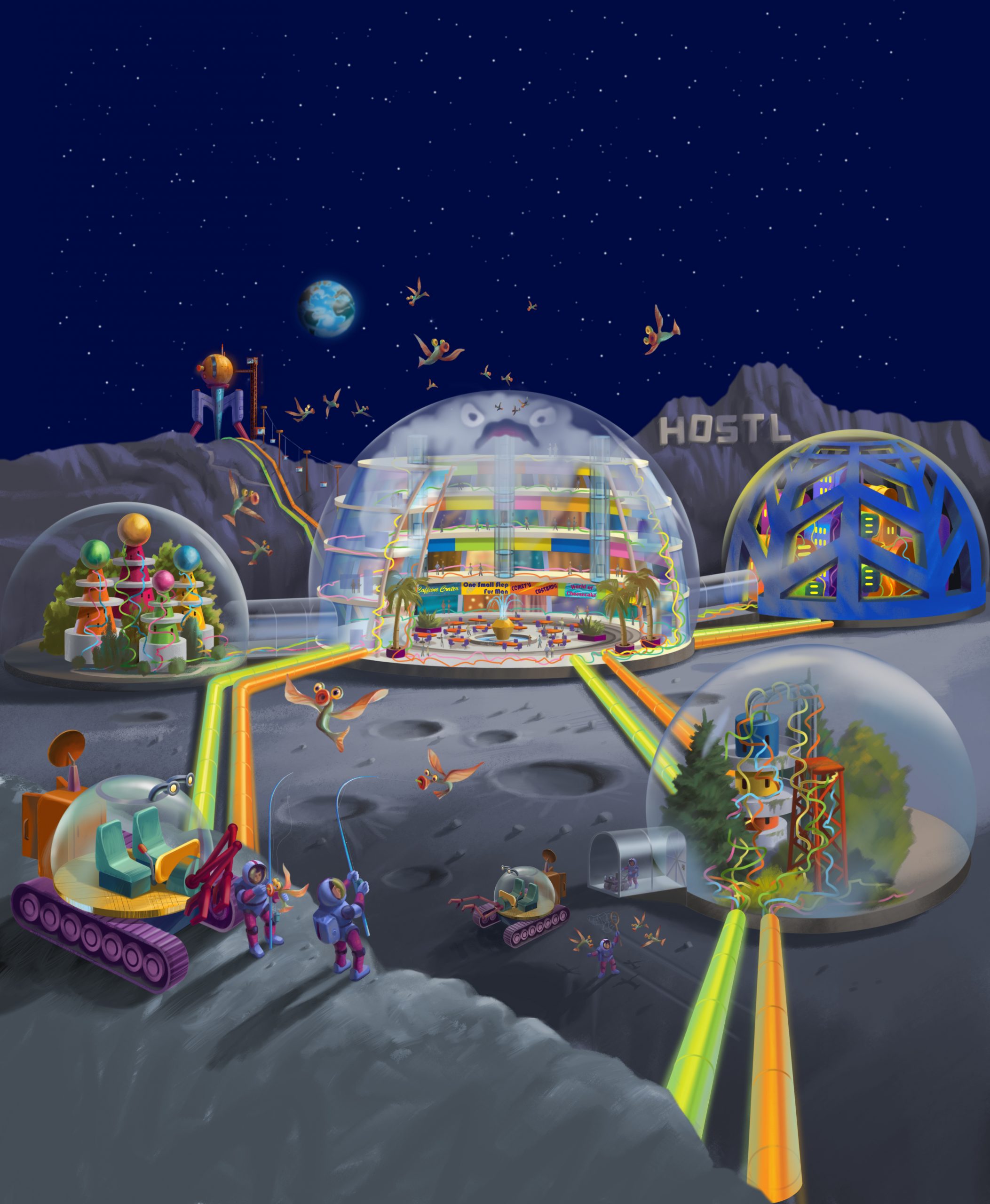On Earth’s moon, in the center of the Mare Serenitatis, stands the Habitable Object on the Surface of The Lunar Landscape, the oldest gateway from Earth to the stars and the only moon construct still in operation. In the center of that port, nestled among the central mining operations and the robotics engineering labs, lies its true heart – the food court.
