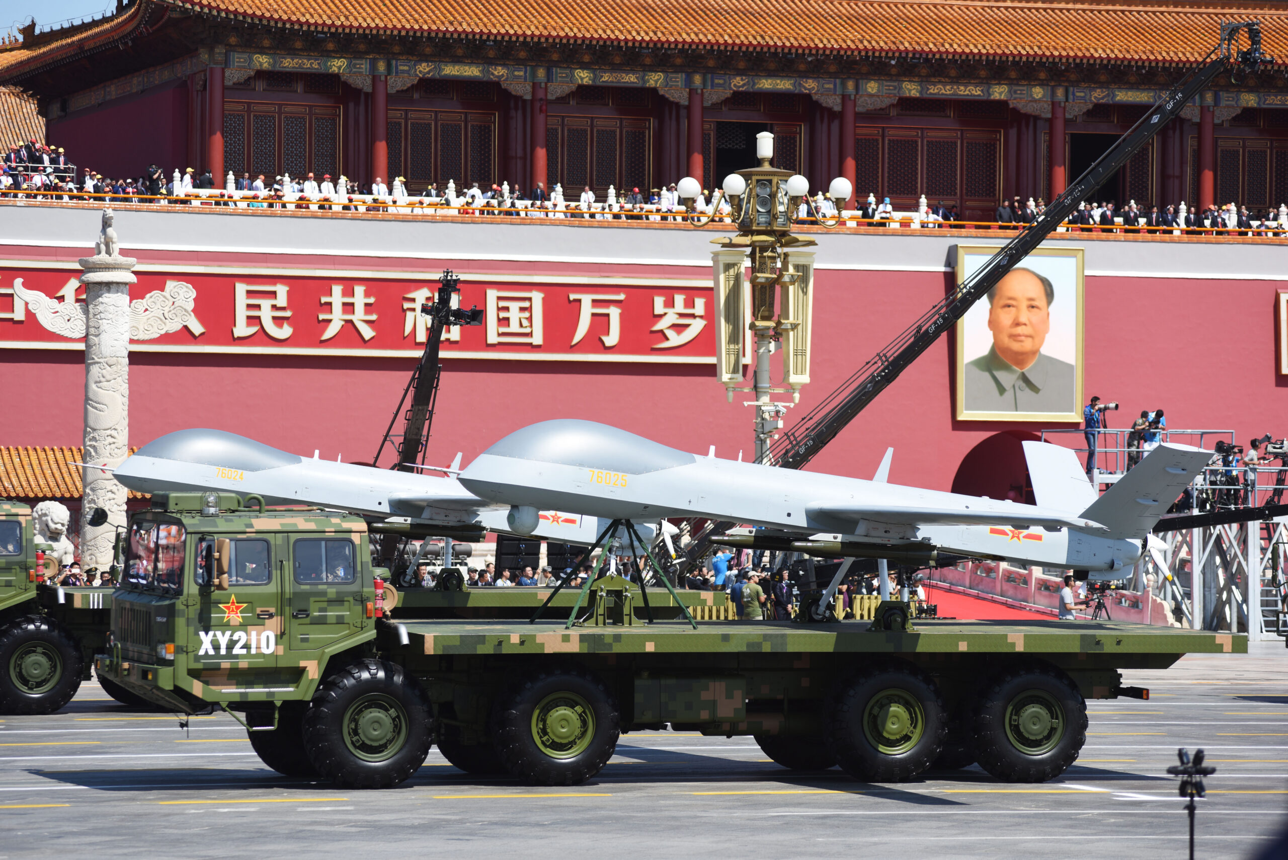 Image: Military vehicles carrying Chinese-made Wing Long drones march past the Tiananmen Rostrum during the military parade to commemorate the 70th anniversary of the victory in the Chinese People's War of Resistance Against Japanese Aggression in Beijing, China, 3 September 2015. Chinese President Xi Jinping announced on Thursday (3 September 2015) he would cut troop levels by 300,000 as China held its biggest display of military might in a parade to commemorate victory over Japan in World War Two. Xi, speaking on the rostrum overlooking Beijing's Tiananmen Square before the parade began, said China would cut by 13 percent one of the world's biggest militaries, currently 2.3-million strong. The Defence Ministry said the cuts would be mostly complete by the end of 2017. The move is likely part of long-mooted military rationalization plans, which have included spending more money on high-tech weapons for the navy and air force. Troop numbers have been cut three times already since the 1980s.No Use China. No Use France.