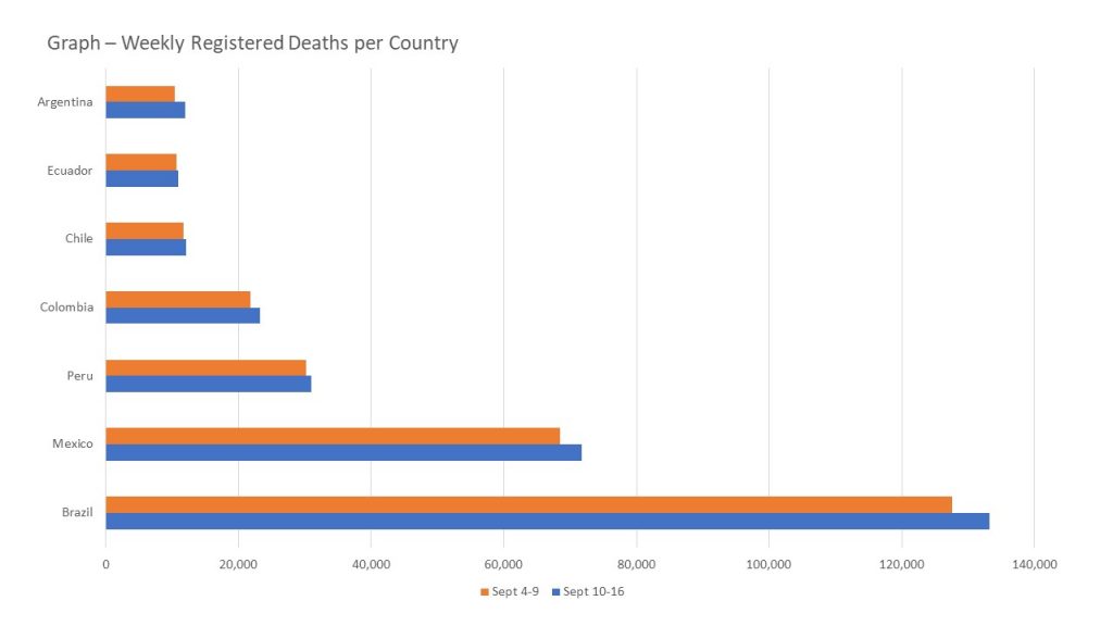 - Deaths – total reported in the region: Brazil (133,207) #2 worldwide, Mexico (71,678) #4 worldwide, Peru (30,927) #8 worldwide, Colombia (23,288) #11 worldwide, Chile (12,040) #14 worldwide, Argentina (11,910) #15 worldwide, [view full list]