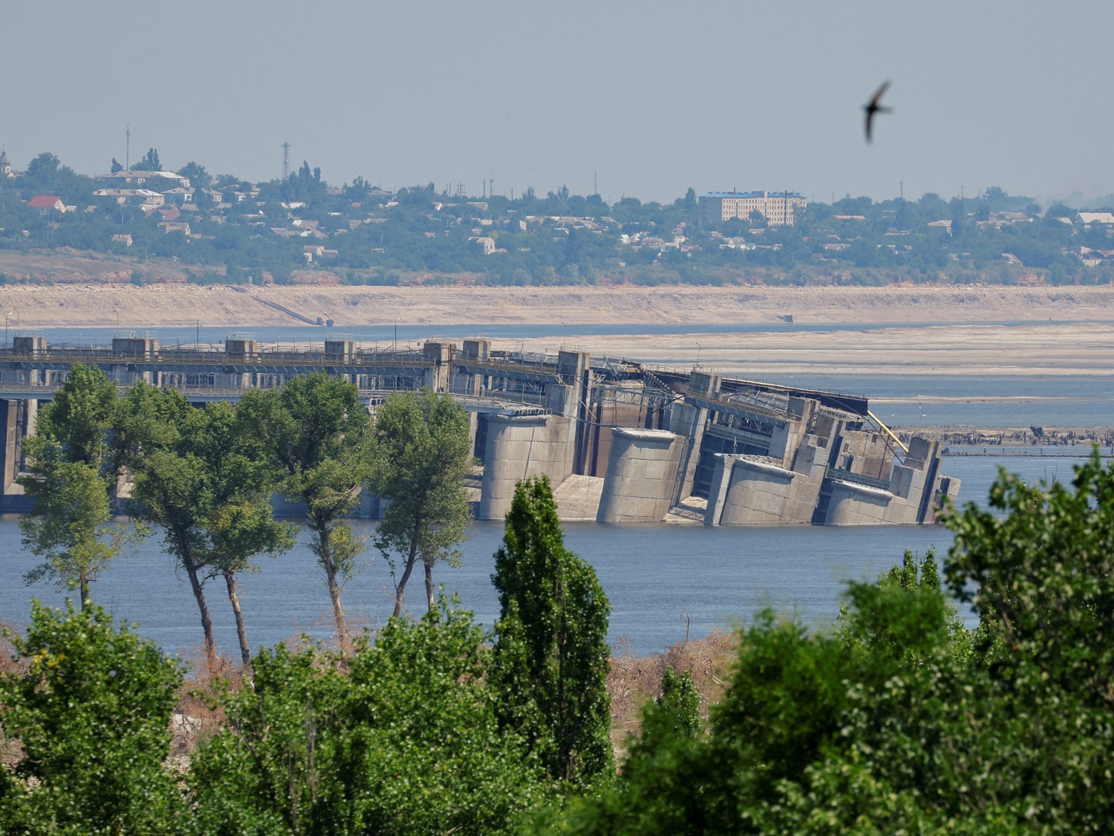 Image: The destroyed Nova Kakhovka dam, town of Beryslav, and Dnipro river bank, dried up after water level sharply dropped following the collapse of the dam, are seen from the town of Nova Kakhovka in Kherson, July 5, 2023. REUTERS/Alexander Ermochenko